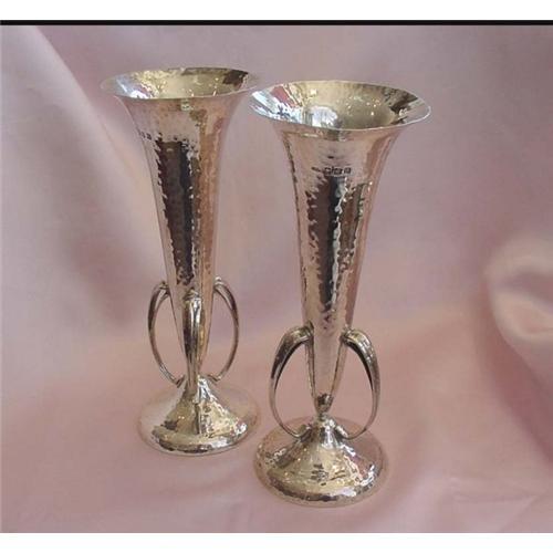 Very fine pair of sterling vases made in Glasgow, Scotland in 1911. These wonderful hand hammered vases have three elegantly curved handles accenting the base. The base is heavy (doesn't tip easily), but is not weighted. Each vase measures 8" tall and has a 3" diameter base. There are four hallmarks including a maker's mark on the top of the vase. There is a barely noticeable tiny ding under the top rim of one vase (found only on close inspection). Otherwise, excellent condition. Weigh 6 3/4 ounces each.