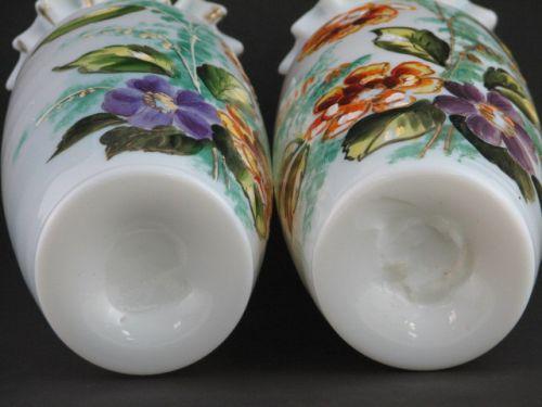 Pair of Hand-blown Vases. Features fine transluscent white glass, hand-crimped rim, hand-painted mirrored-image floral scene and gold gilded highlights, rough pontil. Condition: one vase has small piece of ruffled edge snapped off rim, gild worn on rim. Dimensions: 8.25"H x 3.5"D.