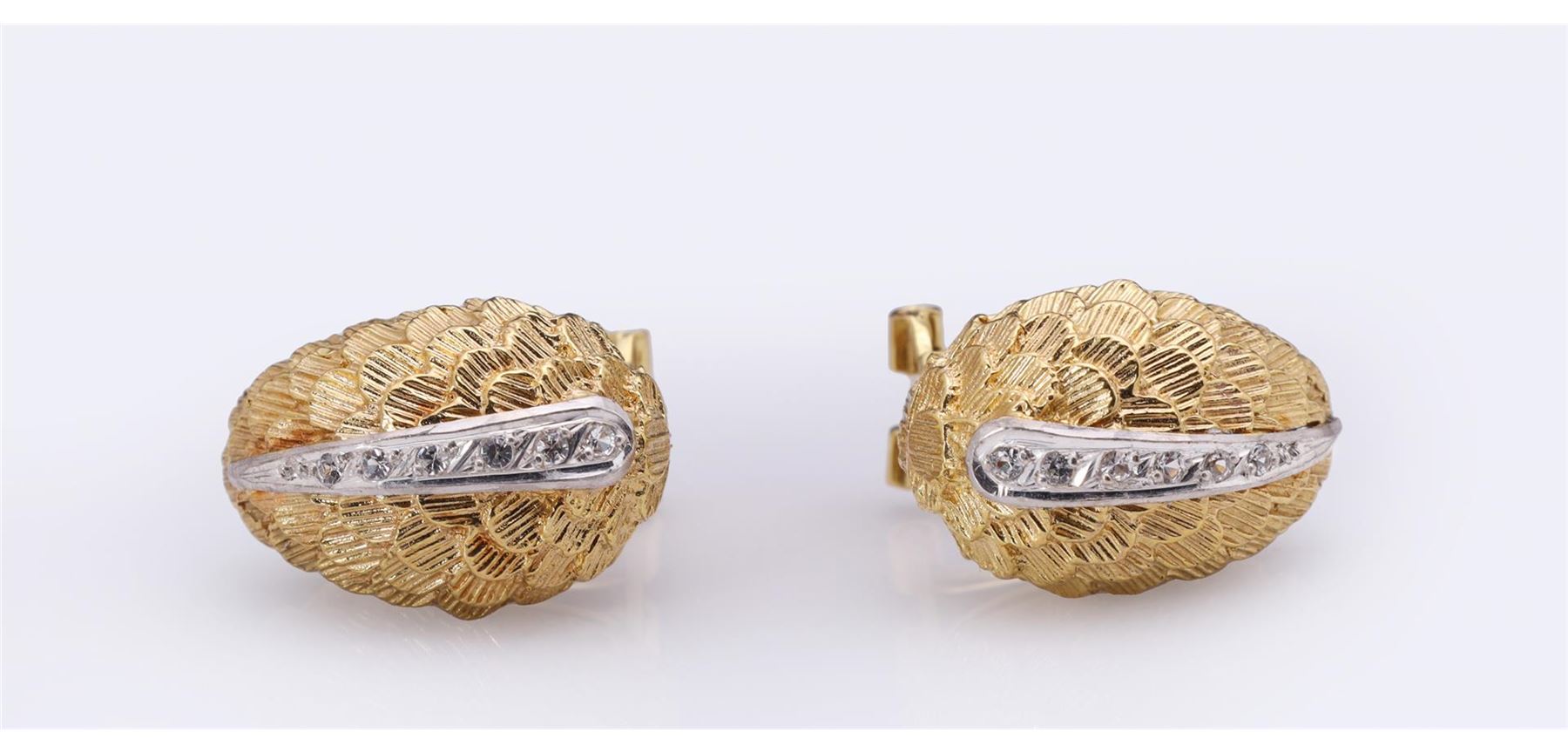 Pair Italian 18K Gold & Diamond Earrings containing twelve round brilliant cut diamonds weighing approximately 0.08 cts. Total weight of 11.6 gm. Estimated retail value $2,800.