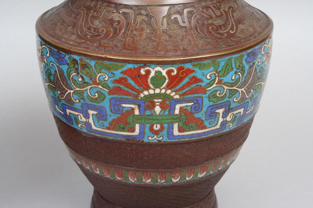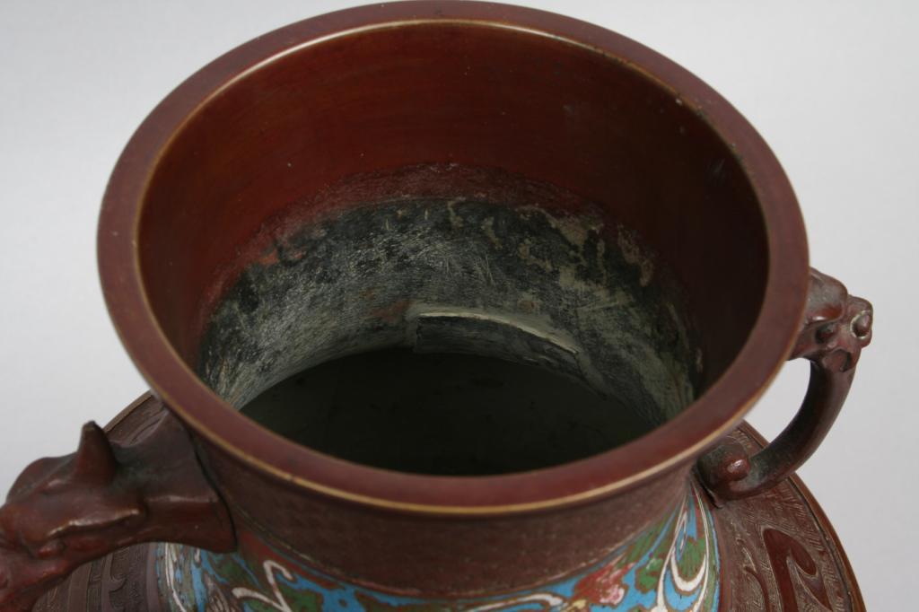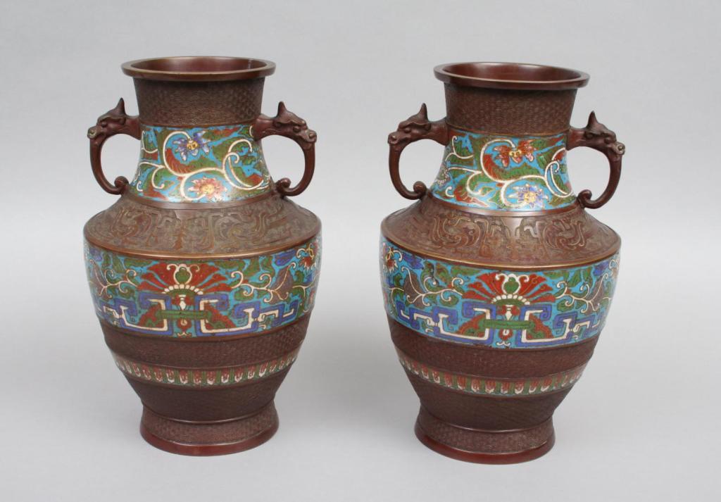 Late 19th or early 20th century, of baluster form, flanked by zoomorphic handles, decorated in the archaic style, one vase stamped "Japan", the other unsigned. 14 1/2"H. Condition: some light wear and pitting throughout enamel work, one vase with small loss and repair to enamel, generally good.