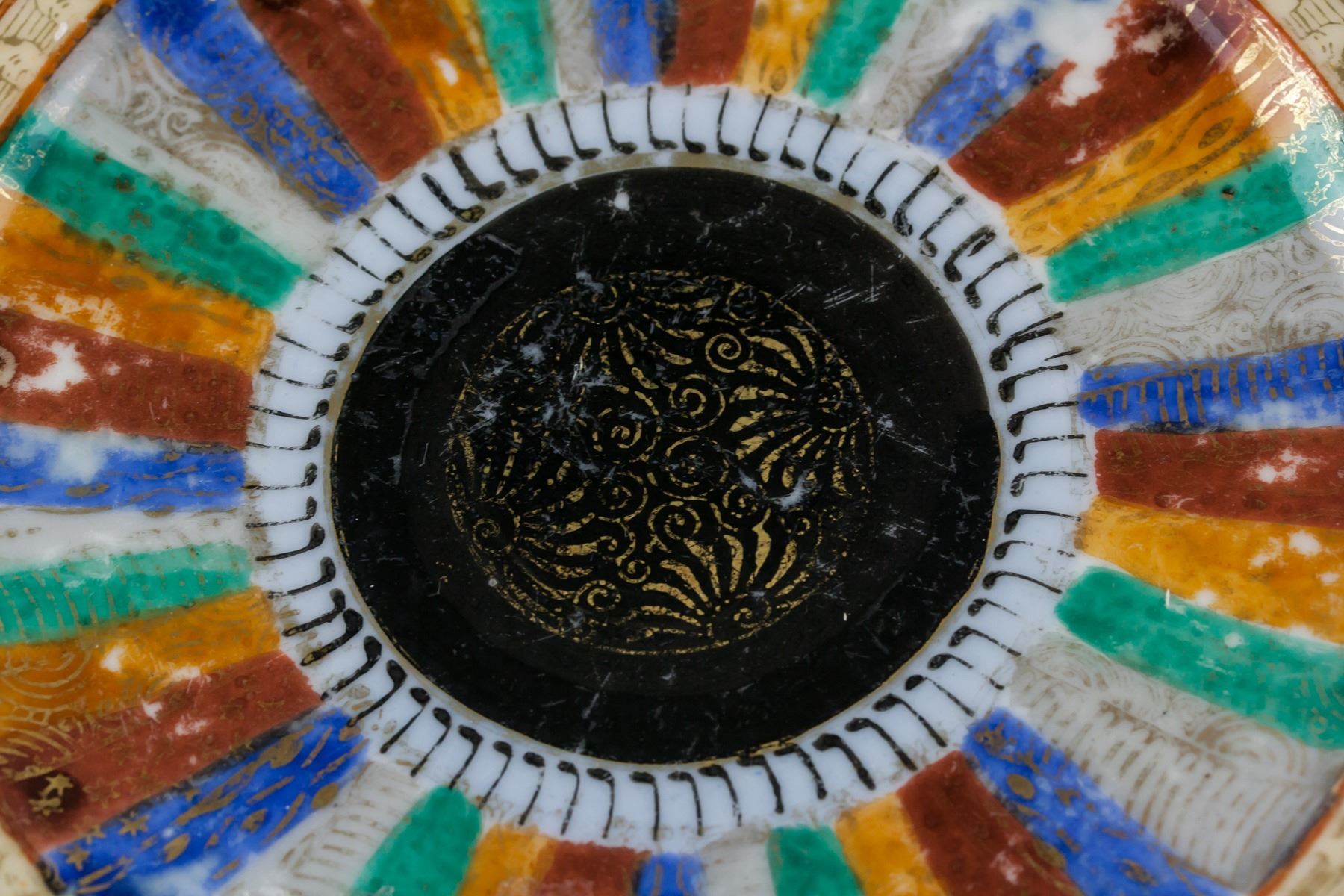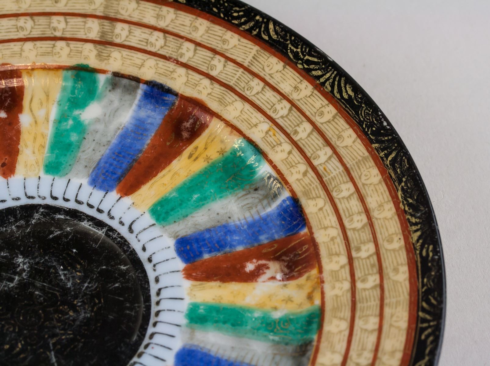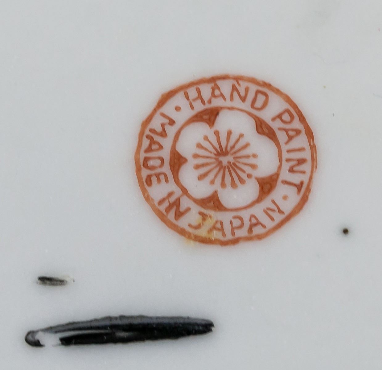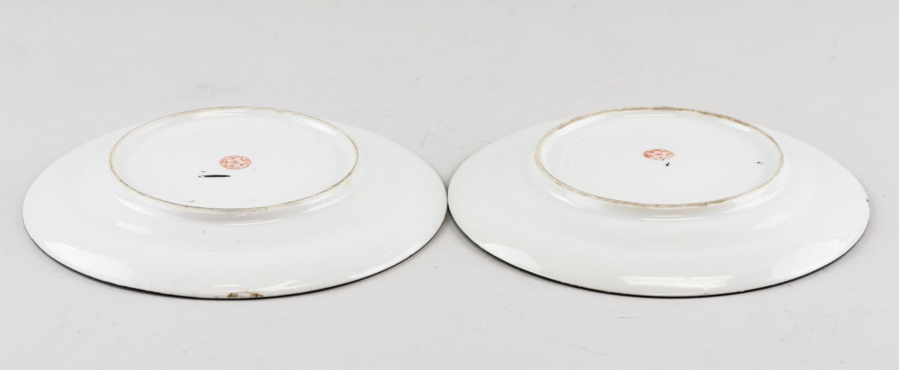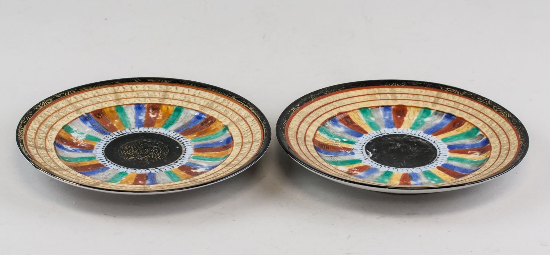 Pair of Japanese pottery saucer. Of round edge, tapering to bottom, supported on short foot rim. Decorated with color bands and leafy pattern. HAND PAINT and MADE IN JAPAN marks on base. 3 x 18 cm, 505 grams (total)