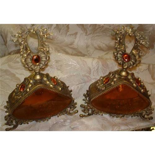 Pair jeweled perfume bottles.Amber beveled glass set on feet. Daubers are in tact one has broken inside flask outside beveled glass is good. SAet with golden amber stones