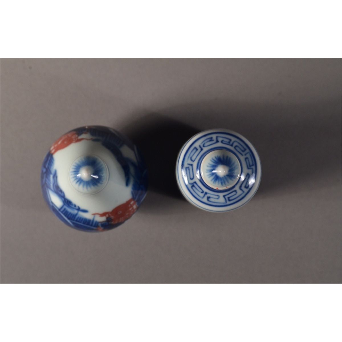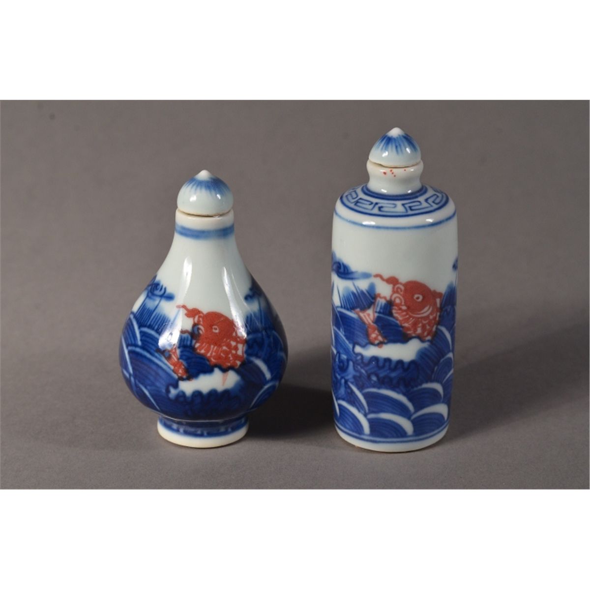 Pair of blue and white snuff bottles: featuring red fish amid waves; stylized Kangxi Mark on base; H; 19 cm, D: 3 cm (1); H: 8 cm, D: 5 cm (2)