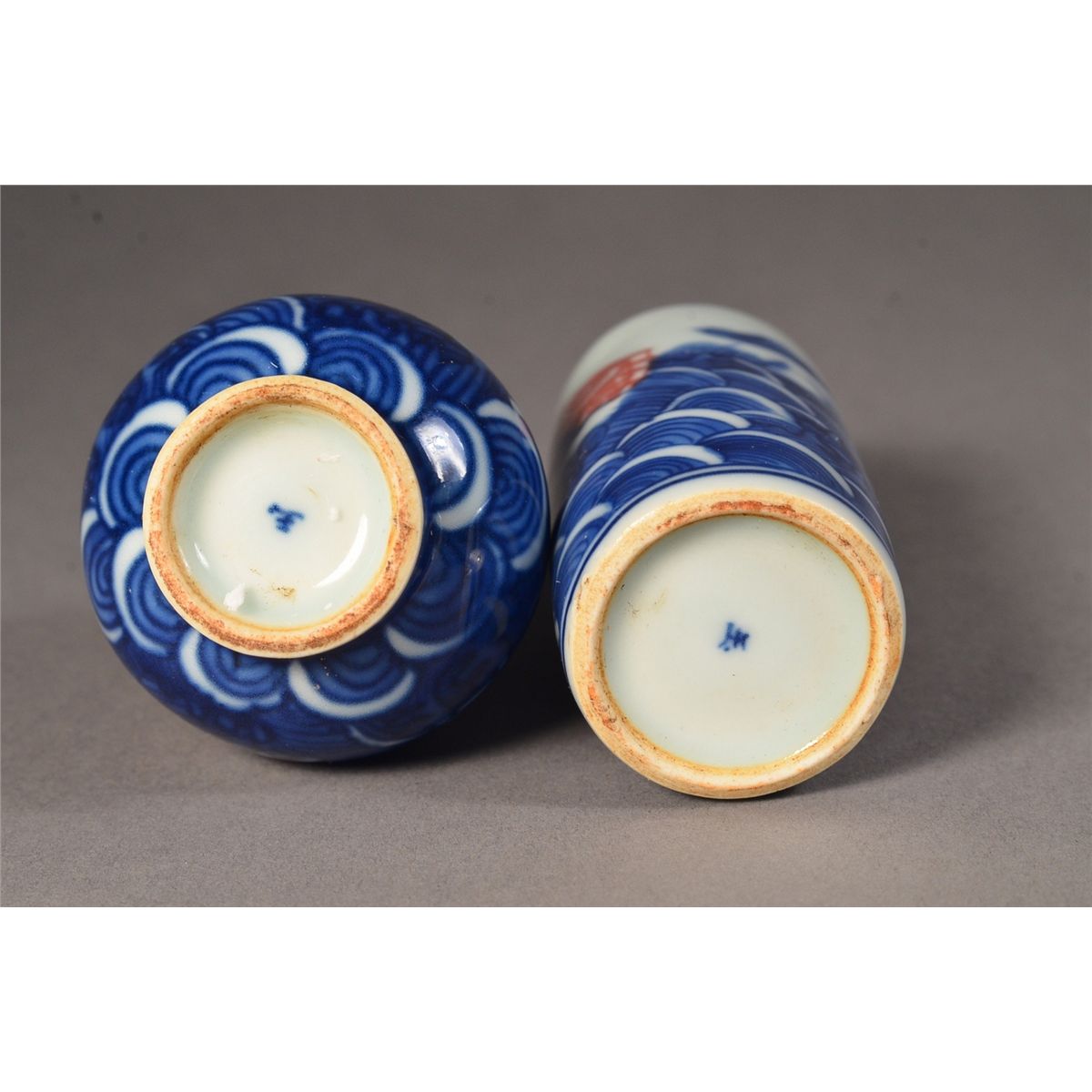 Pair of blue and white snuff bottles: featuring red fish amid waves; stylized Kangxi Mark on base; H; 19 cm, D: 3 cm (1); H: 8 cm, D: 5 cm (2)