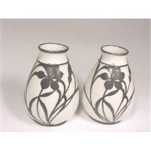 Beautiful vases with silver overlaid on porcelain in Art Deco design. The silver has tarnished so perfectly that the black design on the white porcelain is perfect. I did shine a half inch spot on the back to verify it is silver overlay. It could be completed returned to the silver but it is so striking this way. They are 4 inches high and three inches wide. The pair weighs one-half pound. The mark on the bottom says " Limoges WG&C France". Very thin porcelain. Exquisite. CONDITION: They are in excellent condition. No chips or mars. CUSTOMER SERVICE: We give a money back guarantee, within 7 days, if the item is found to be other than described and returned in the condition received. So bid with confidence. We accept Visa, MasterCard, money orders and check. Buyer pays the exact postage and insurance. We mail the same day for credit and money order. We mail the day after a check clears.