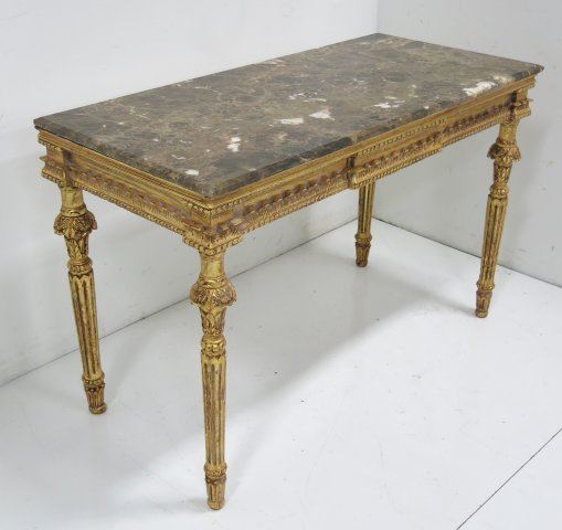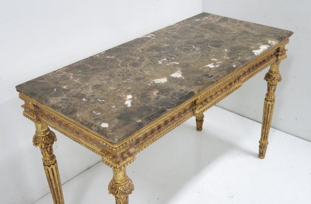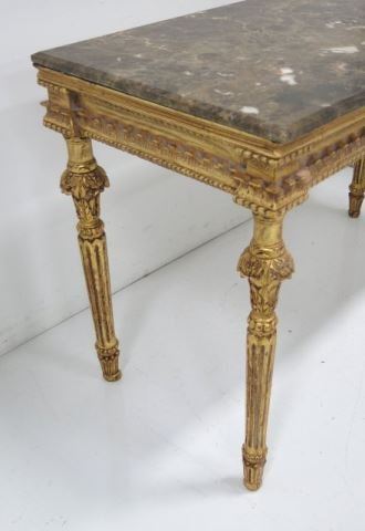 Circa mid. 20th century. Heavy gold leaf. Heavily carved. Unusual marble color. Approx. 33" H x 24" D x 52" W.
