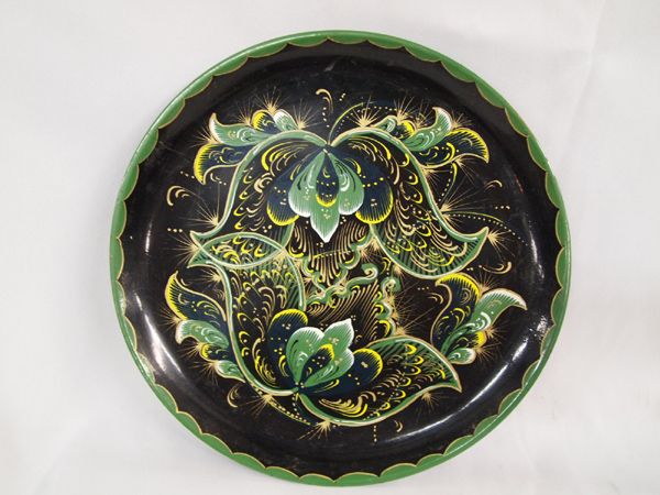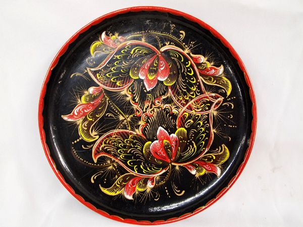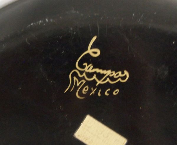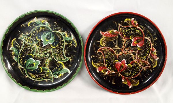 Pair Mexican Lacquerware Plates Michoacan. Both pieces signed by ''Campo'' ''Mexico'', one in greens and the other in reds, all on black lacquer. Measrues 10'' diameter. Beautiful native artistry.
