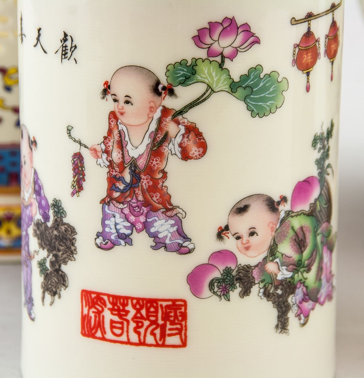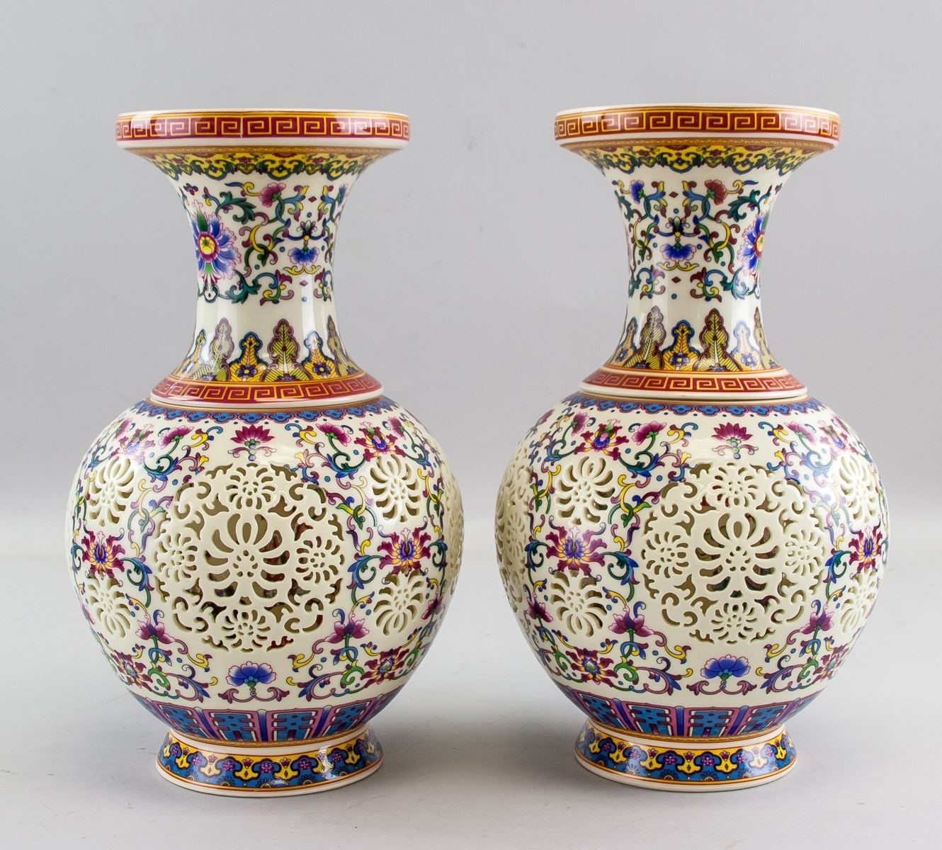 Pair of modern Chinese porcelain revolving vase, of globular body, supported on splayed foot rim, exterior shell with open work carving of floral pattern, painted with floral, leafy and geometric pattern, interior shell printed with playing boys, made by Yiran, four-character Qianlong mark on base, 28.5 x 15 cm, 919 grams each