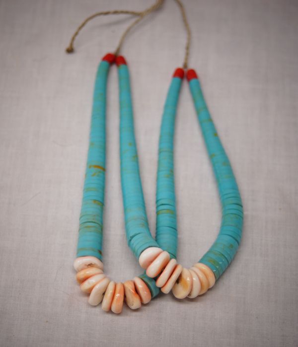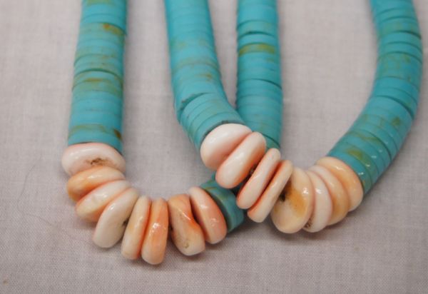 Pair Navajo Bisbee Turquoise Jocklas. Pink shell with graduated Bisbee turquoise heishi beads, coral bead at the top. Measures 5'' in length.