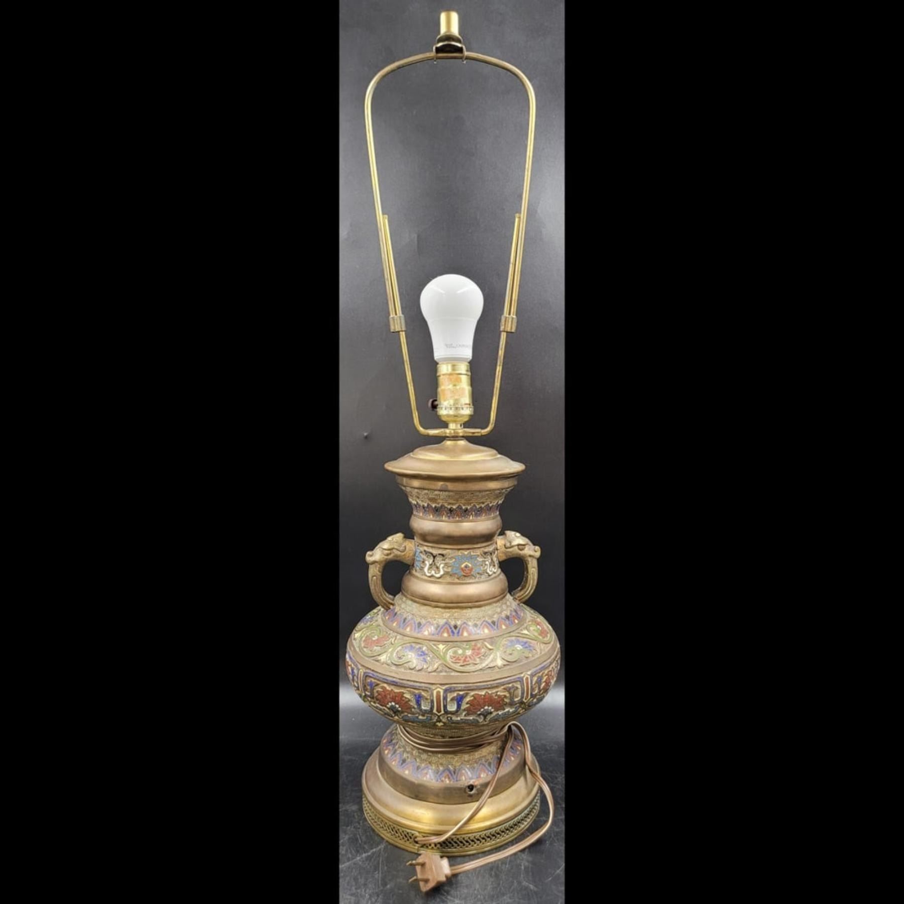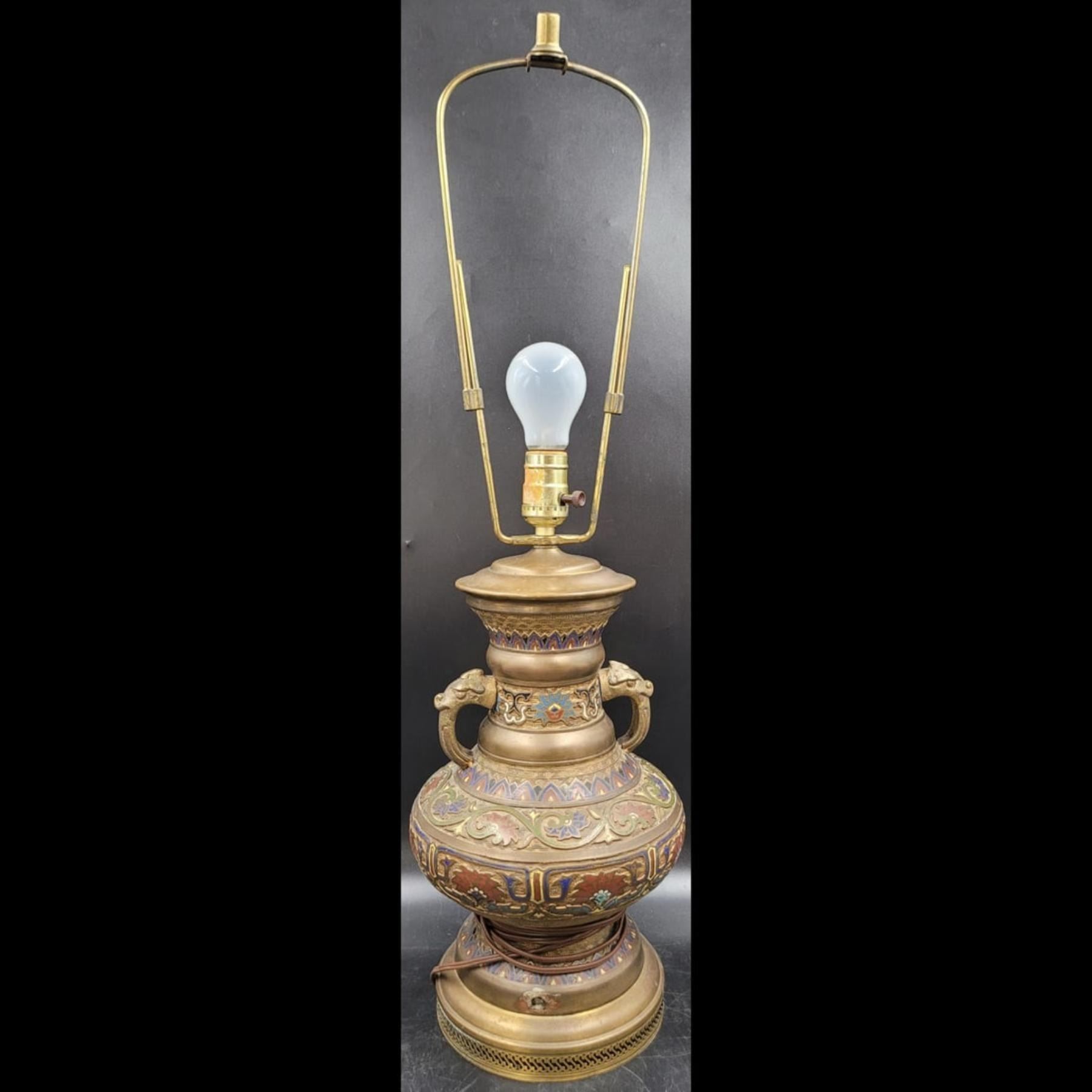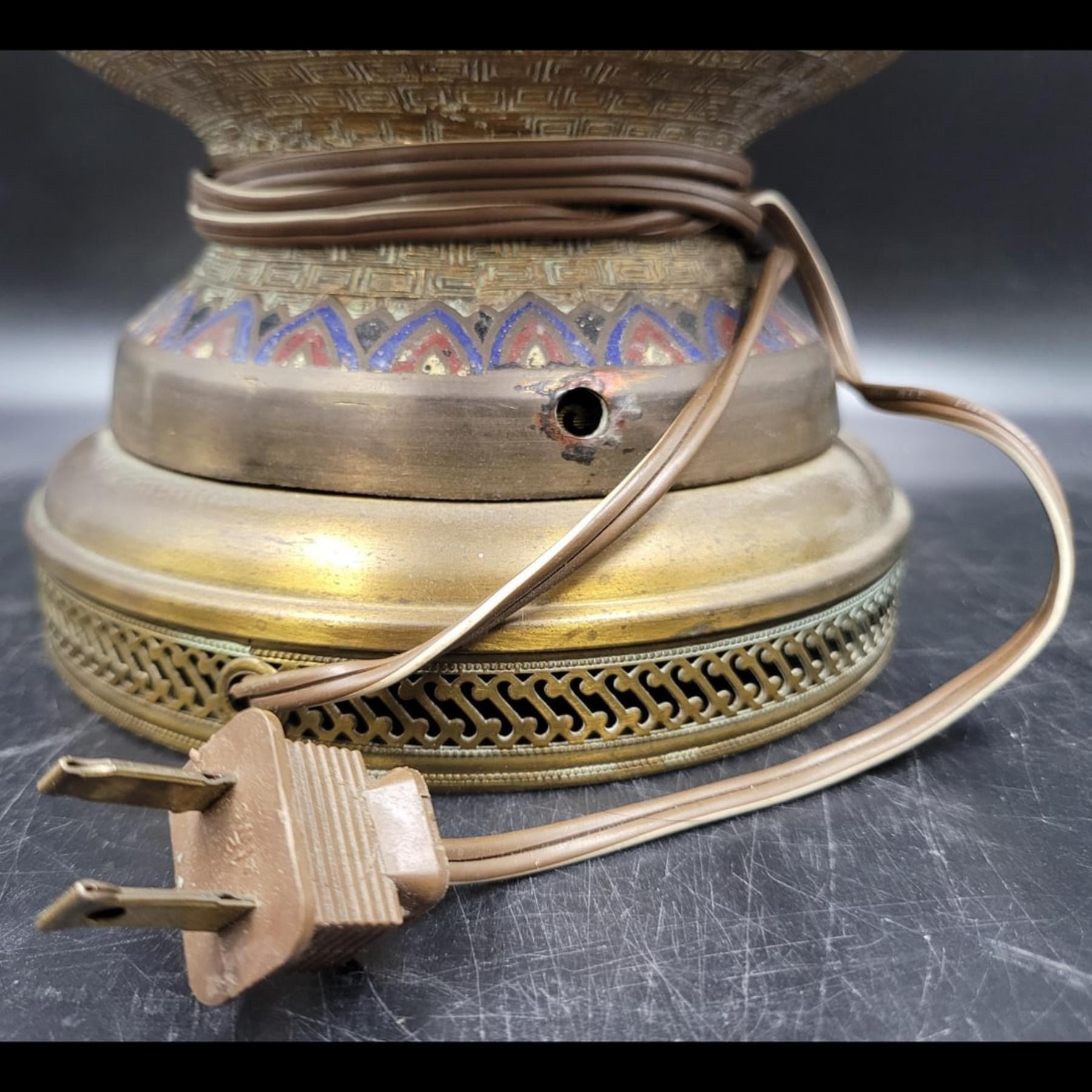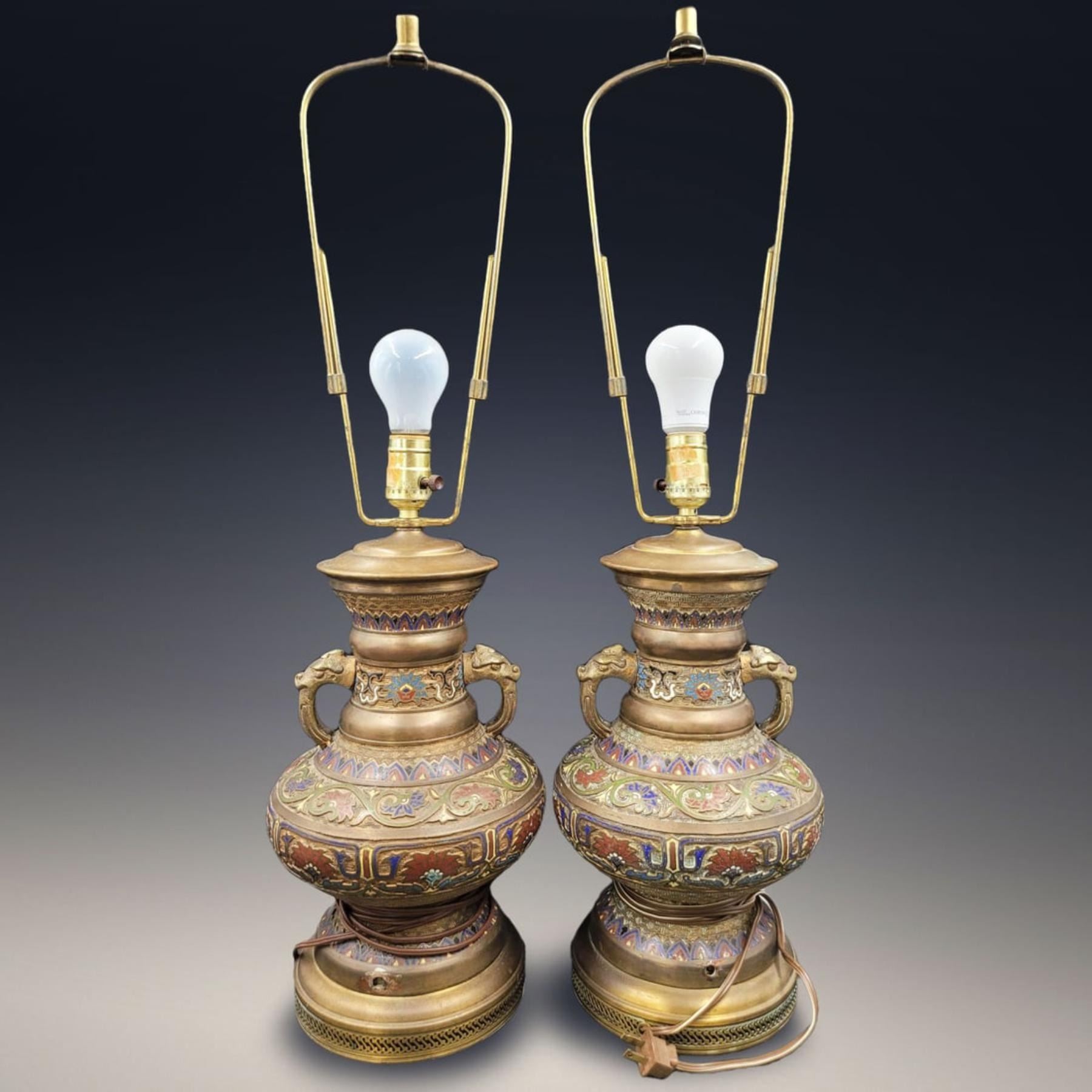 Pair Of Brass Champleve Table Lamps. measures approx. 32" X 9" X 9"