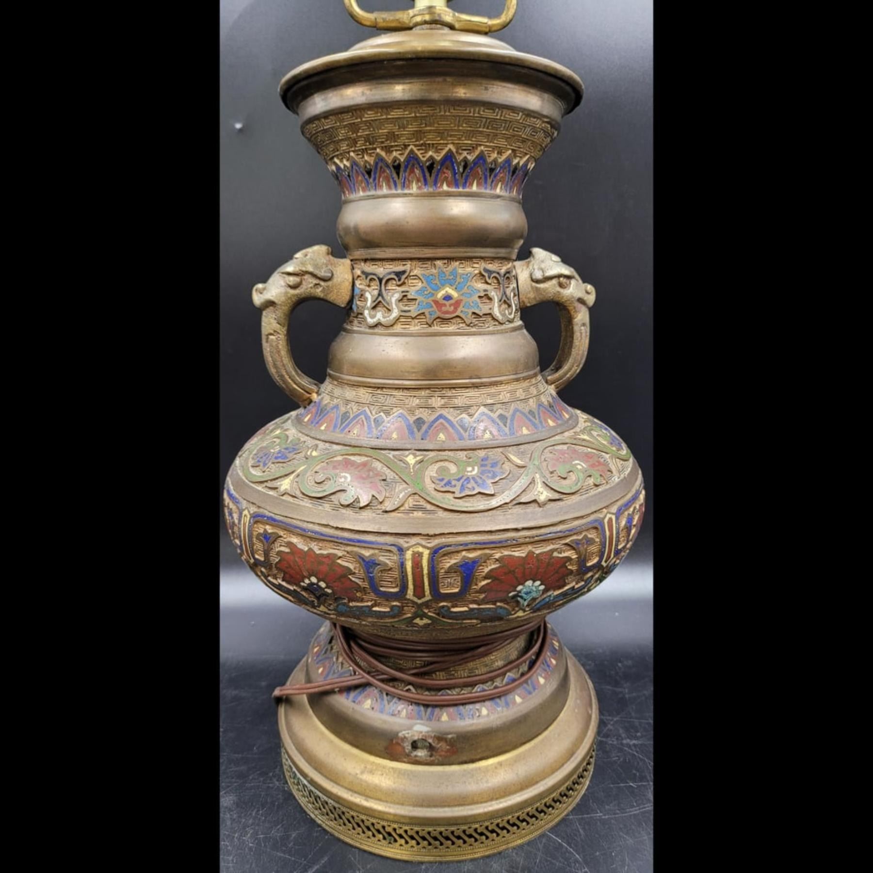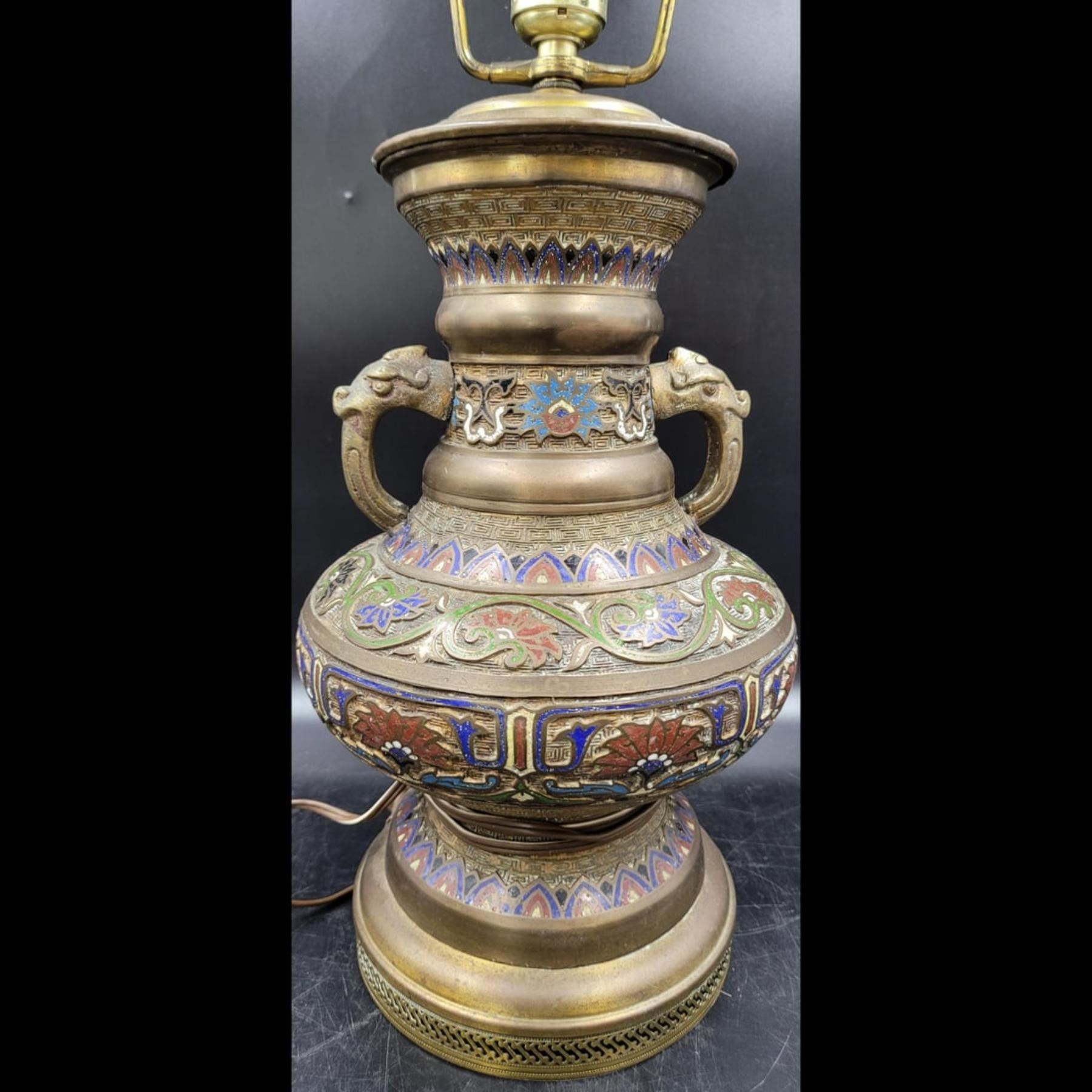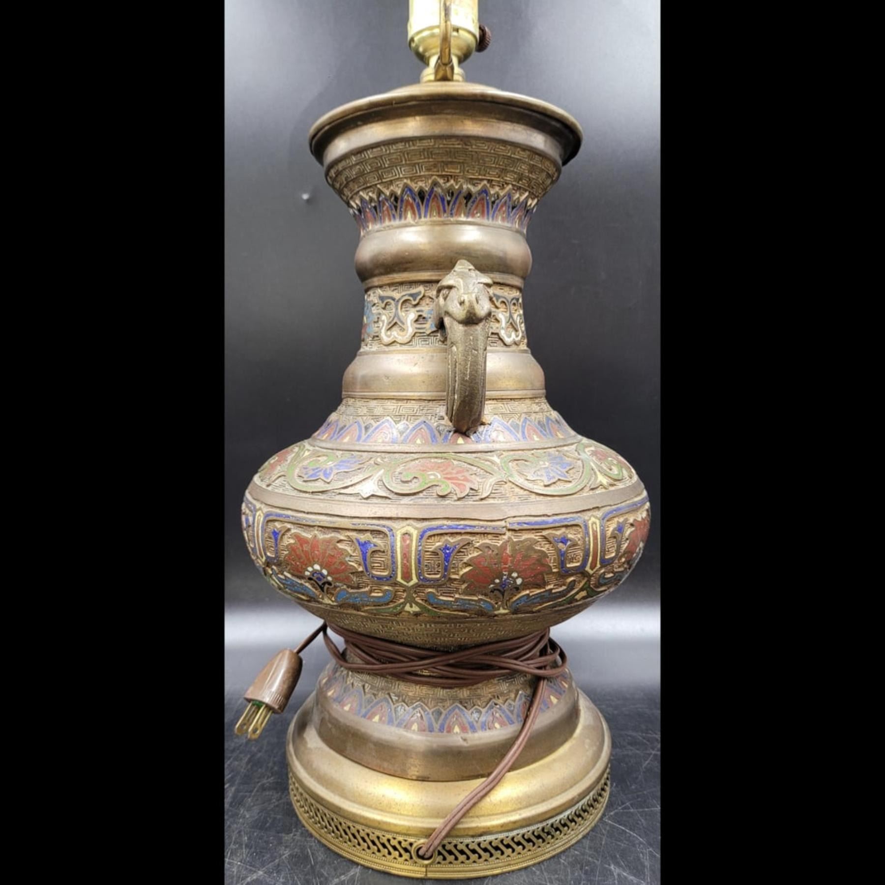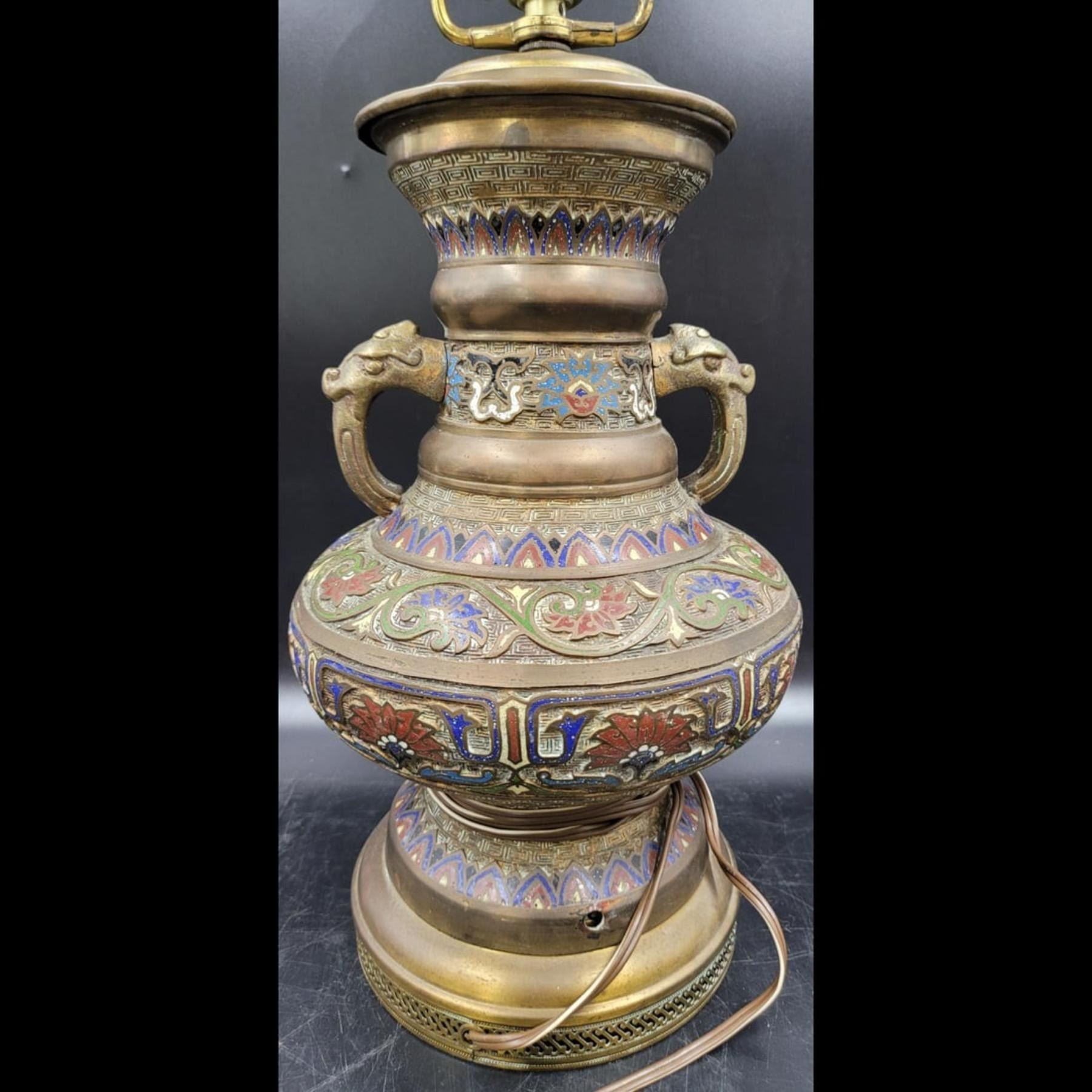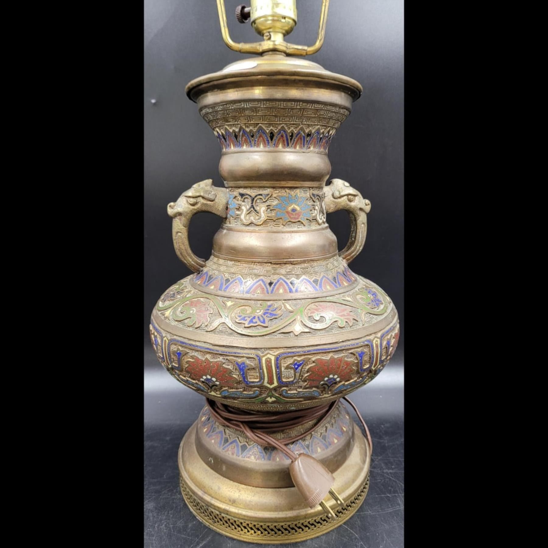 Pair Of Brass Champleve Table Lamps. measures approx. 32" X 9" X 9"