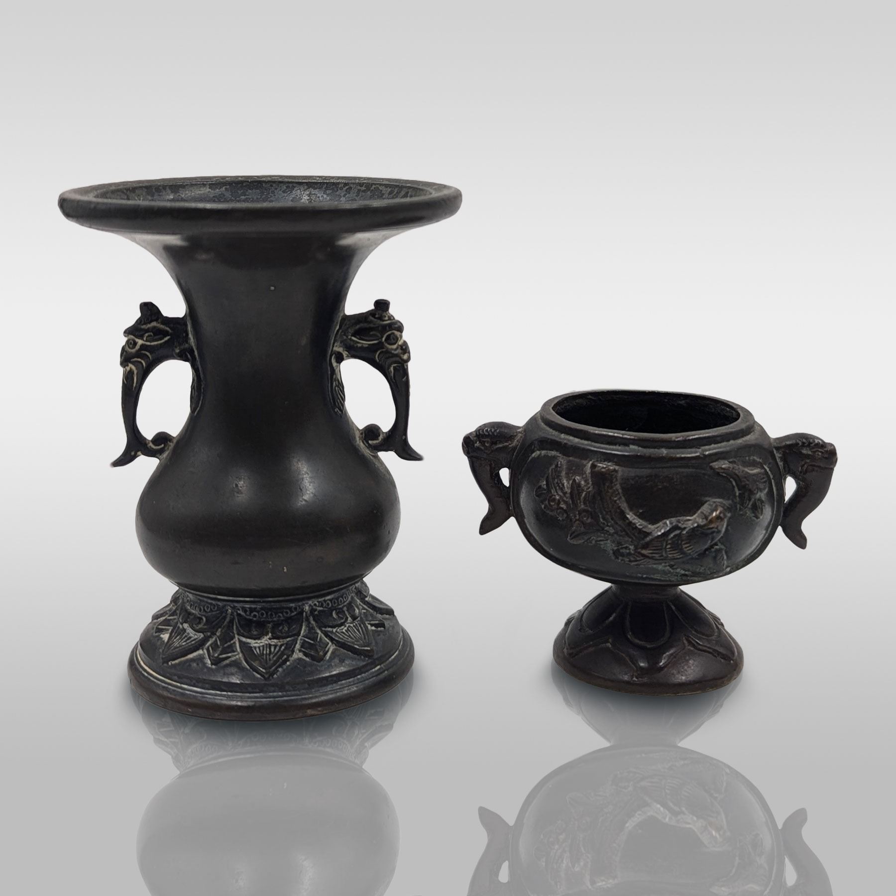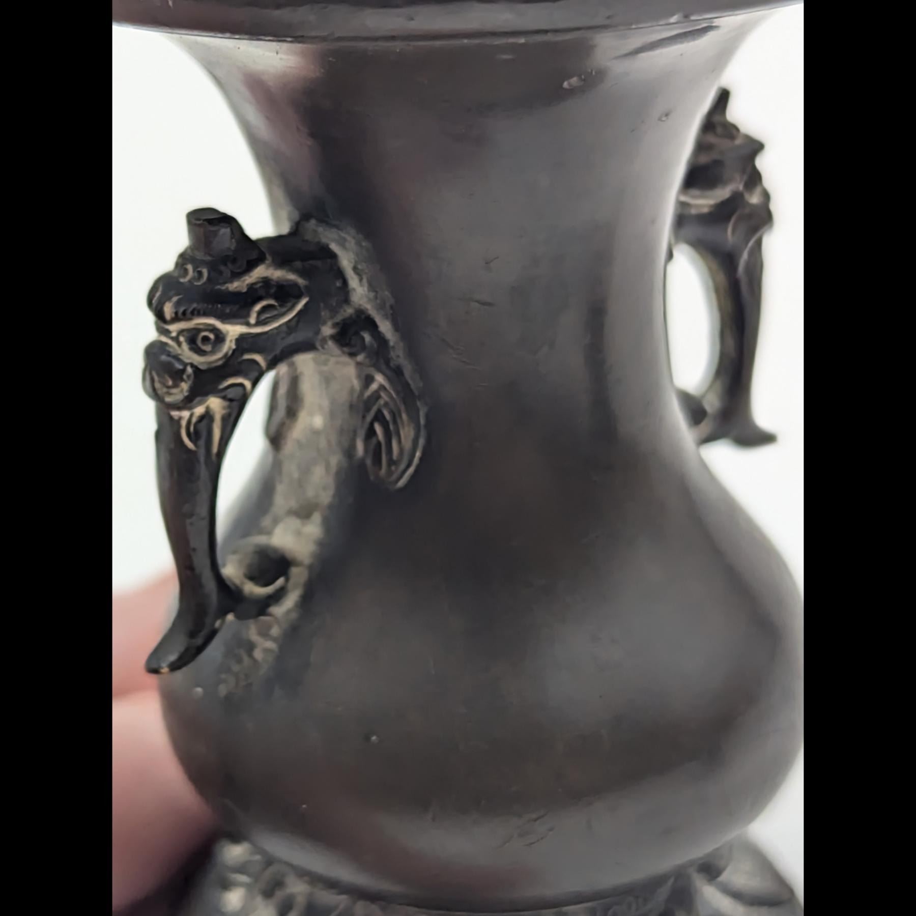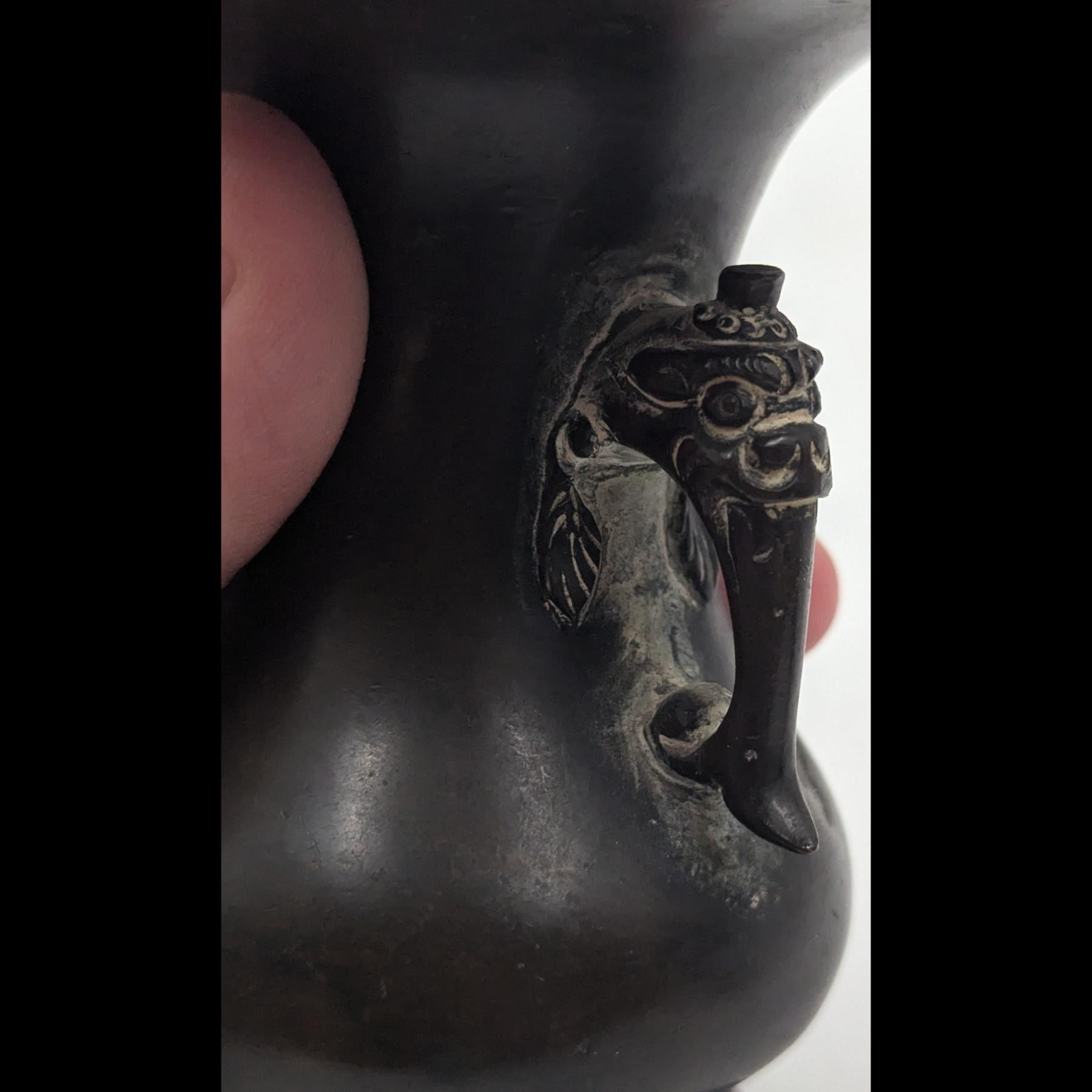 Pair Of Chinese Bronze Miniature Vessels, Both With Animal Head Handles