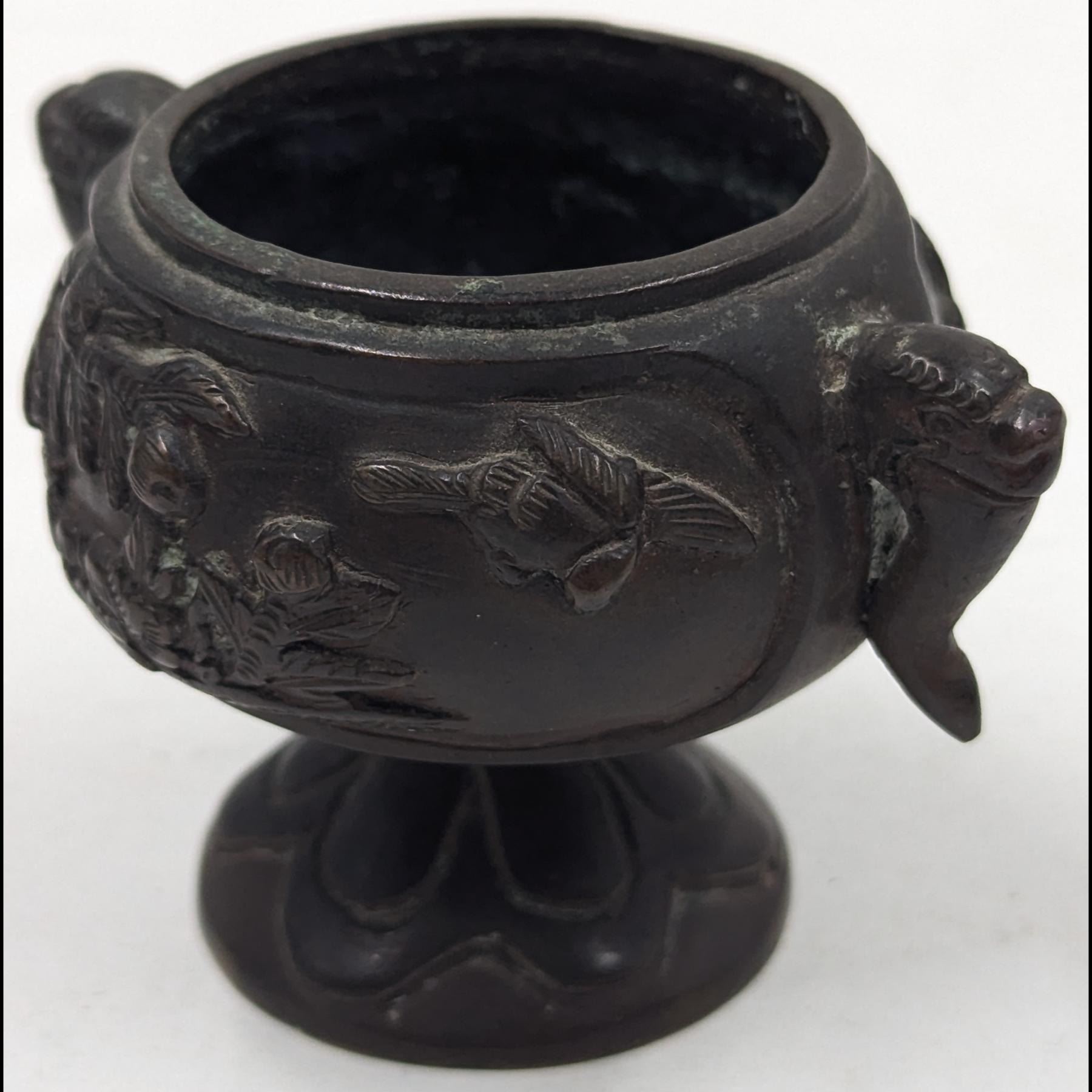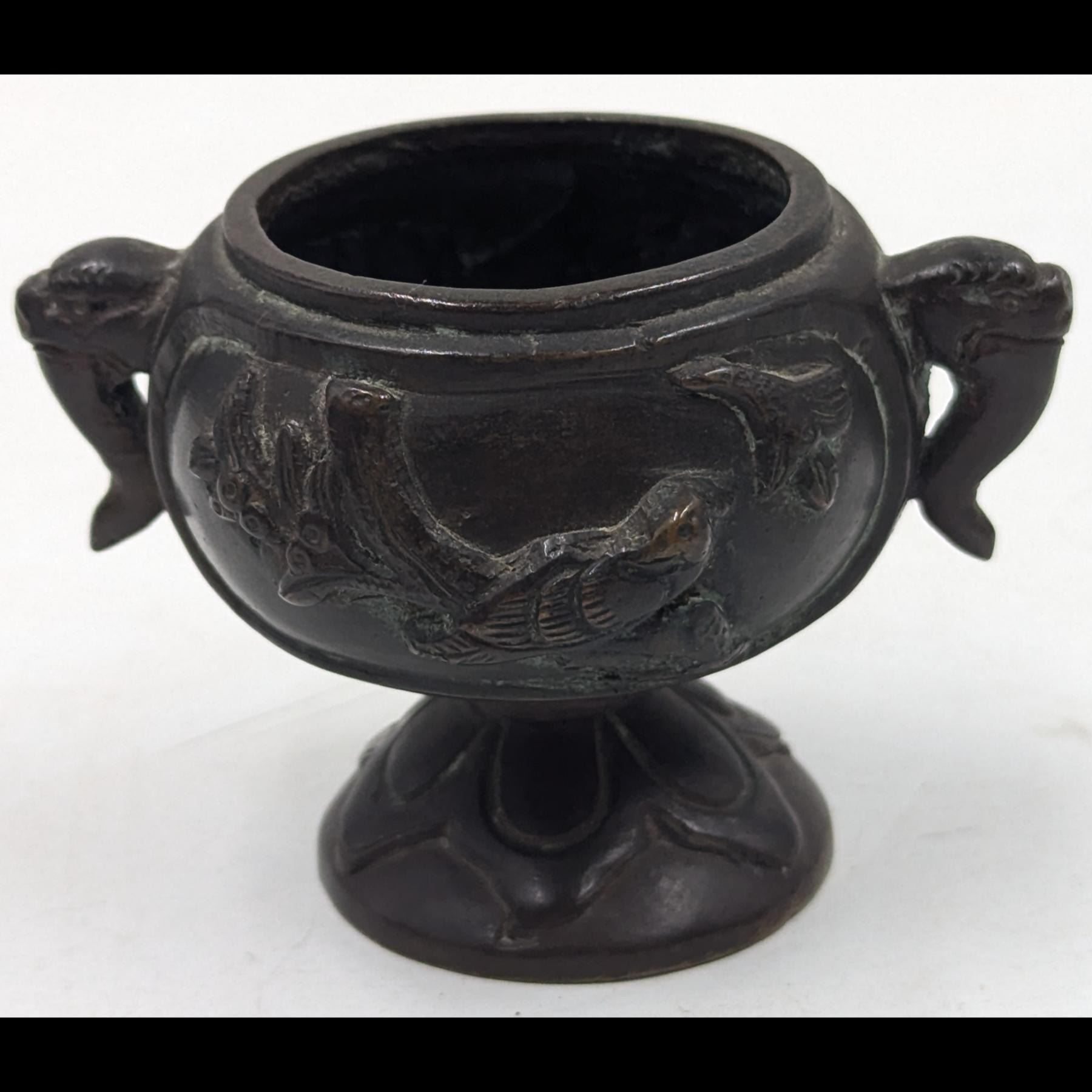 Pair Of Chinese Bronze Miniature Vessels, Both With Animal Head Handles. Measures approx. 2 1/4" X 3" and 4" X 3 1/4".