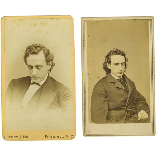 <B>Pair Of Fine Edwin Booth <I>Cartes de Visite</B></I>.</B></I> Edwin Booth (1833-1893), American actor and brother of John Wilkes Booth it two poses. One, from Brady's National Portrait Gallery is an excellent image of a somber Booth looking straight at the camera. Both CDVs are in very good condition.<BR><BR><b>Shipping:</b> Small Flat (<a target="_blank" href="http://www.heritageauctions.com/common/shipping.php">view shipping information</a>) <BR><BR><B>Important notice:<