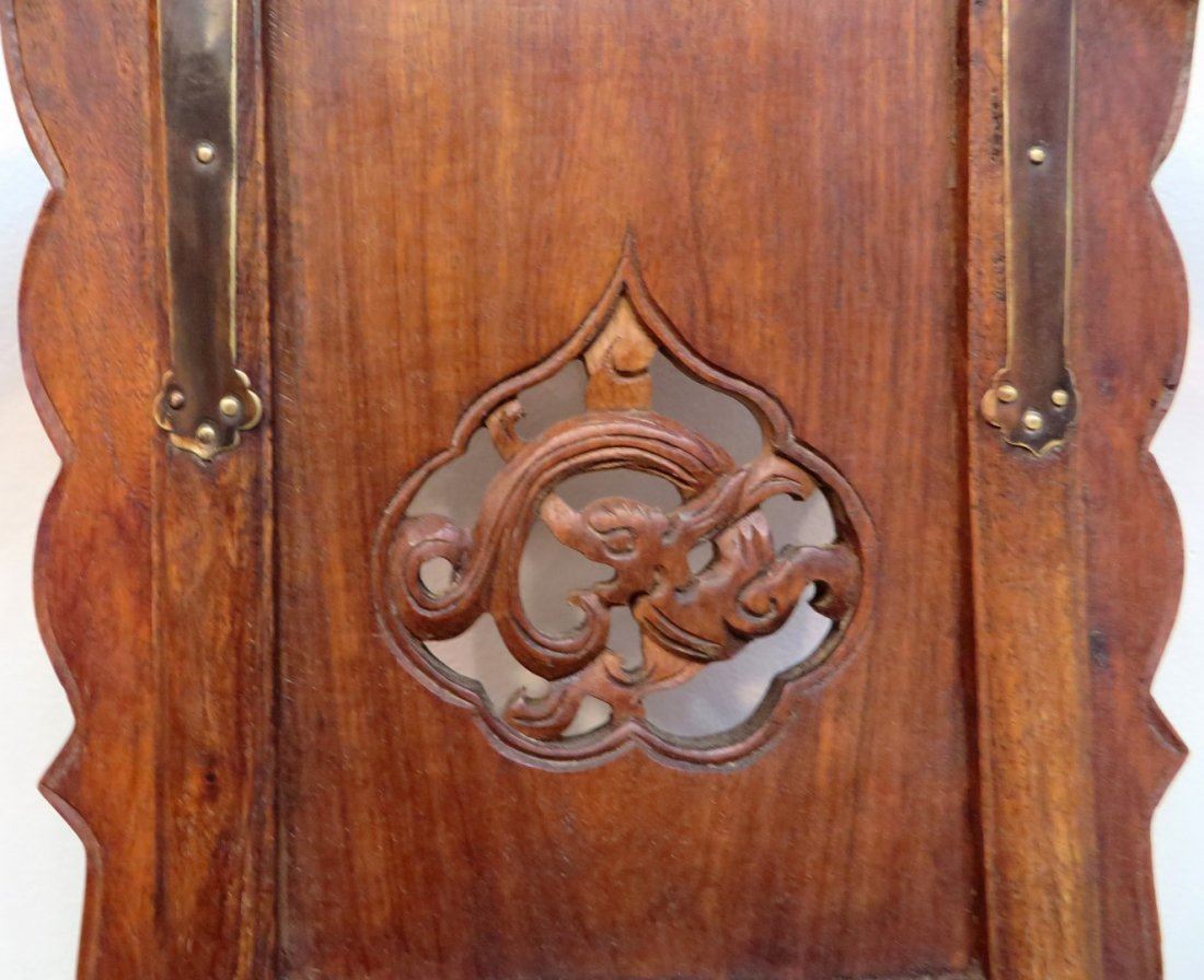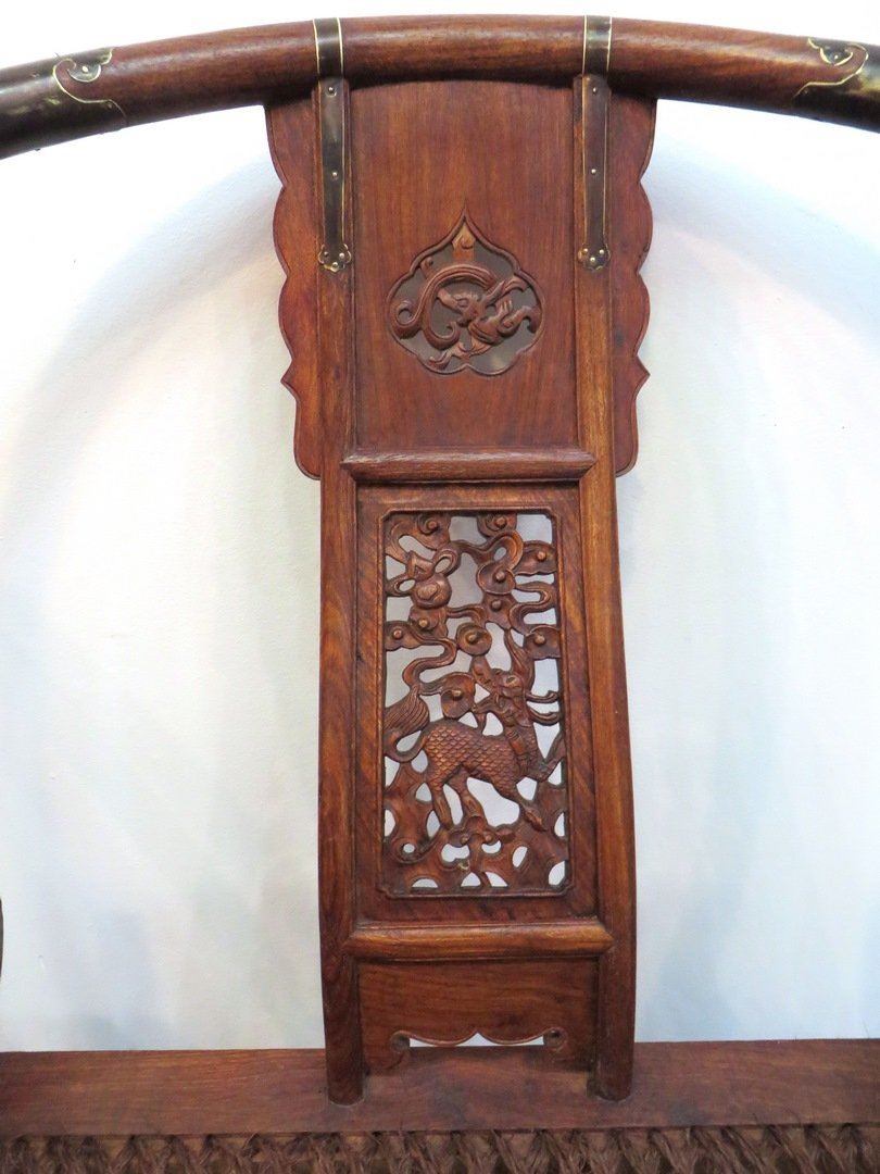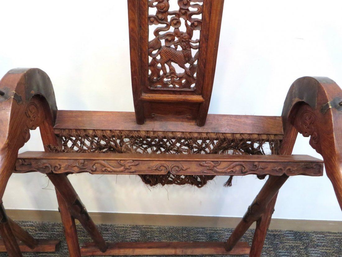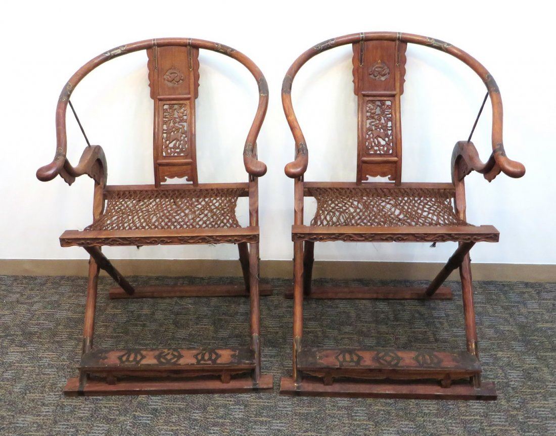 Two horseshoe shaped folding chairs. Pierced backsplat panel of a carved animal and dragon above. Woven seat and brass fittings. No reserve!