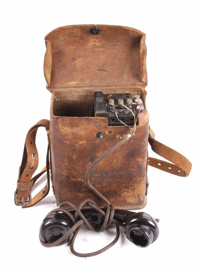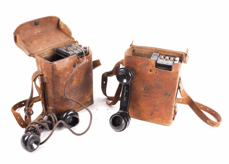 This lot features a pair of EE-8 military field phones. Both are in there original leather bags. The EE-8 Field Telephone was used by the Signal Corps from before World War II through the Vietnam War. Both are marked Signal Crops U.S. Army telephone EE-8-A. Neither telephone has its original batteries. The overall condition of the pieces are good. Measures: 10" H x 7" W x 3 1/2" D