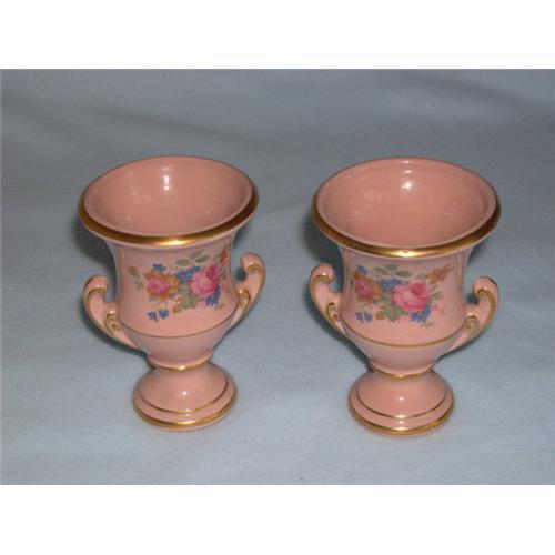 Pair Old porcelain Pink Flowered Vases. Signed with a P 150 on bottom of each one. They are 4 1/2" H X 3" across. Very colorful and show they are aged, beautiful flowered with gold trim. Great condition and make great gift item that's for sure. Enjoy.