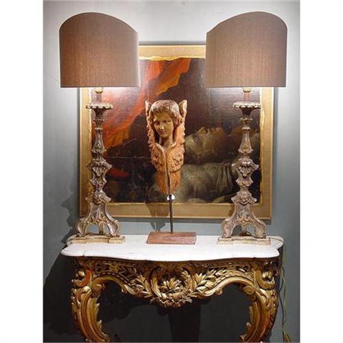 Carved in wood accented with a decorative silvered patina, these Altar sticks have the look of 18th C. pieces, yet this set is of a more modern vintage, likely dating to the last half of the 20th C. Discovered in Central Italy, the set has a striking Tuscan appearance. Made in the traditional manner, the artisans have graced the set with a wonderful decorative finish. The narrow, "half-form" construction makes the lamps ideally suited for use on a table or mantle where their backs are to be placed near to a wall. The slender footprint permits the lamps to sit on a narrow surface approximately 7" wide. The lamps' tall form and graceful silhouette is dramatic and sure to add an elegant flair to any décor.