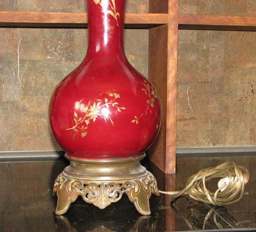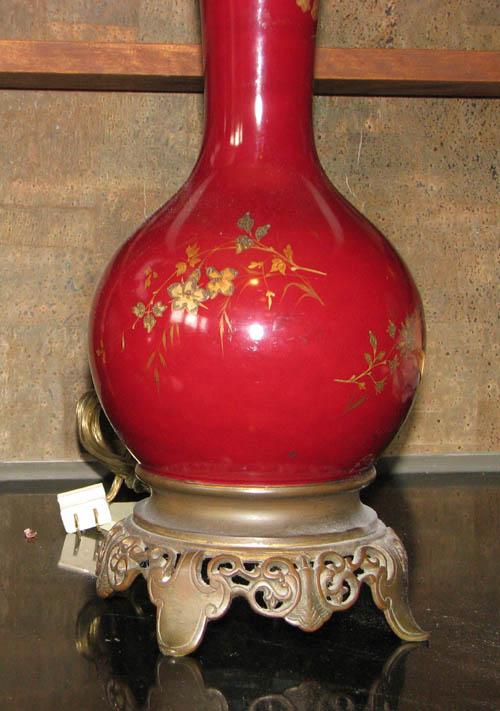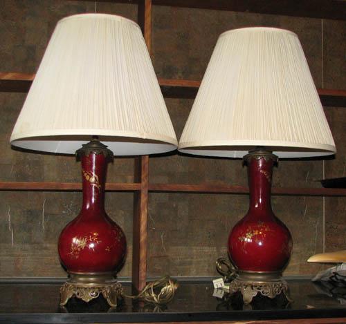 Title: Pair Painted Chinese Cloissane Vases converted to lamps with fitted brass bases, floral branch decoration on red ground