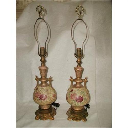 Pair of porcelain European hand painted table lamps C.1900 with ornate metal gilt bases. Antique cream background with shades of deep rose and lighter pink floral,sage green leaves and taupe trim. Light pink necks with gold speckled overtones and handles. New garland finials as well as new complete American wiring. Work wonderfully and in excellent condition. No nicks,chips or cracks. Measure 32H X 7L X 7D.