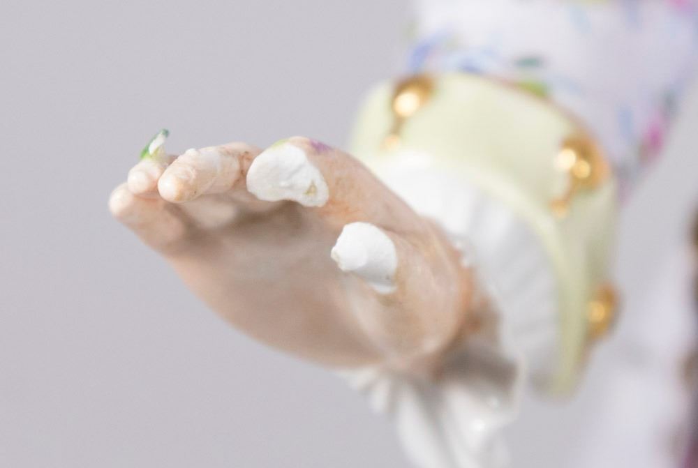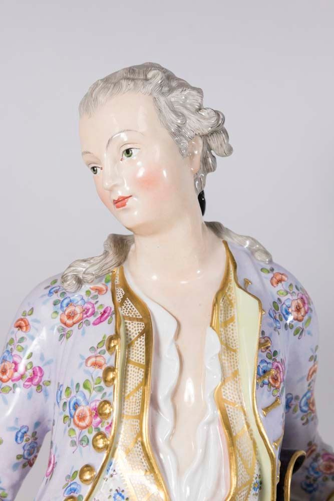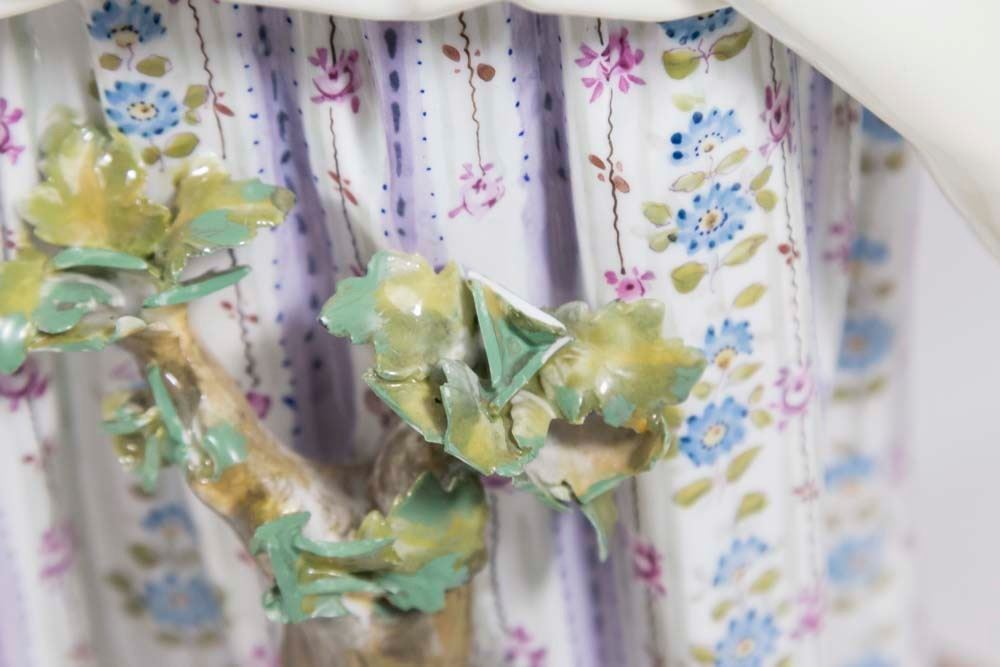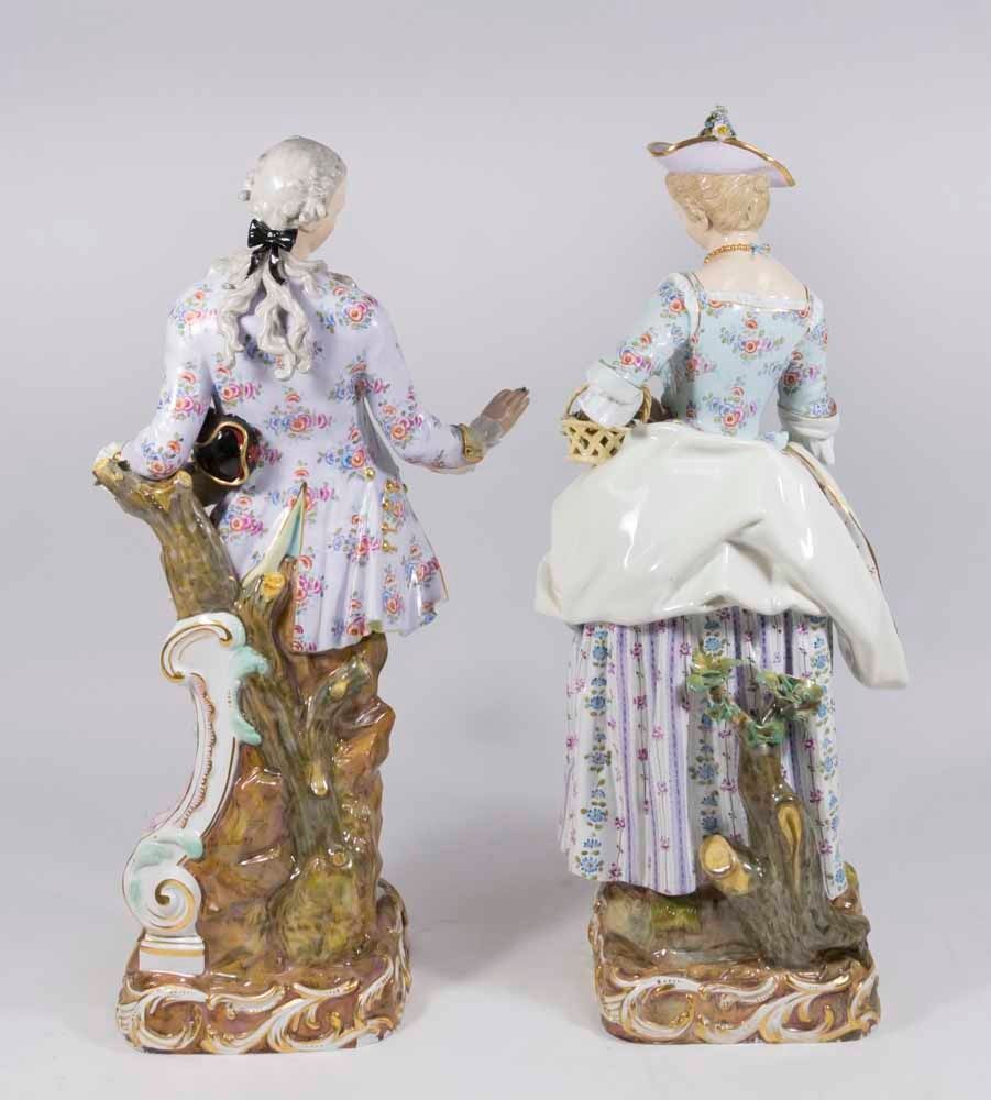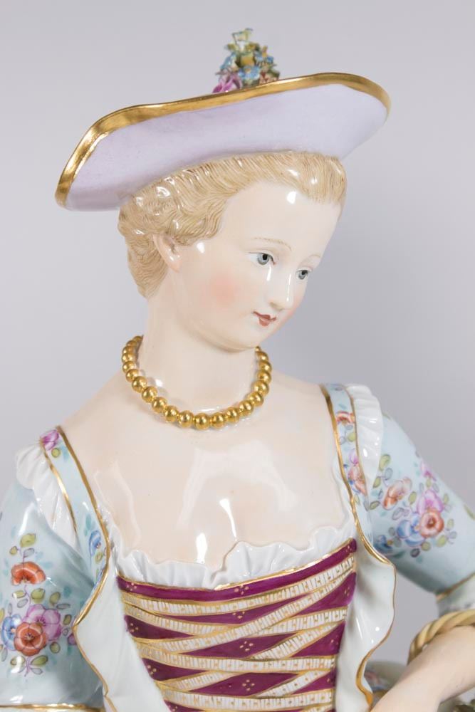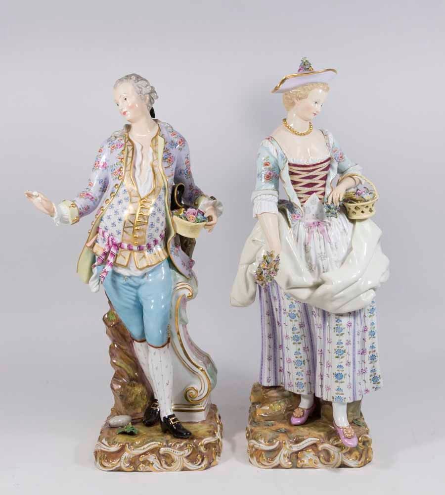 Man and woman with basket of flowers. Approx. 20 1/2" H. From an Edgewater, NJ estate. Losses to man's hand and woman's flowers.