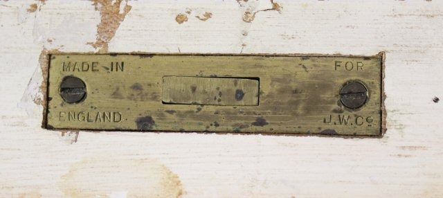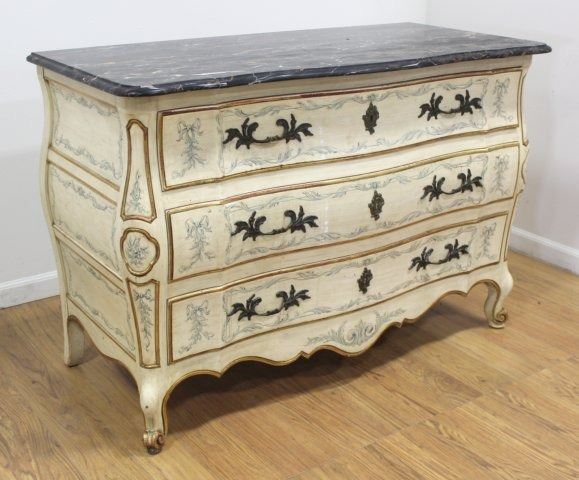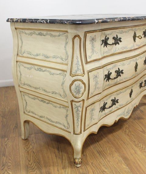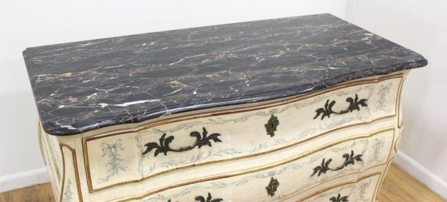 Black marble top. Venetian style. Paint decorated. Key lock. 3-drawer. Lock stamped Made in England. Approx. 33 3/4" H x 49" W x 23 1/2" D.