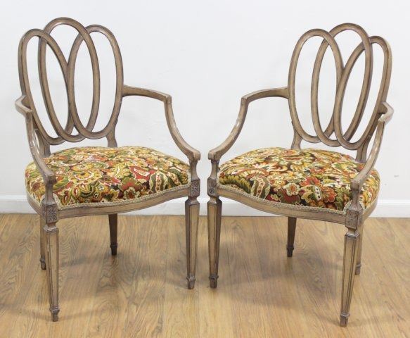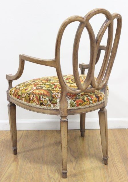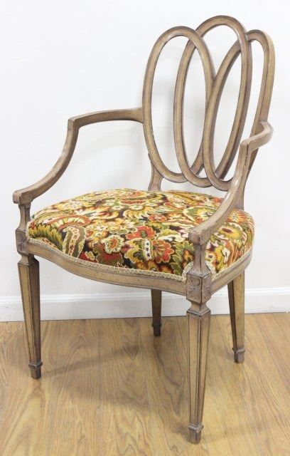 Circa 1950s. Needlepoint seats. Distressed finish. Approx. 37 1/2" H x 22" W. Wear to finish.
