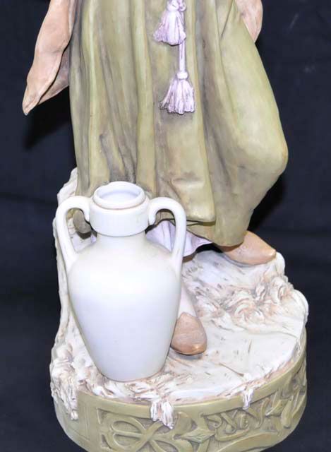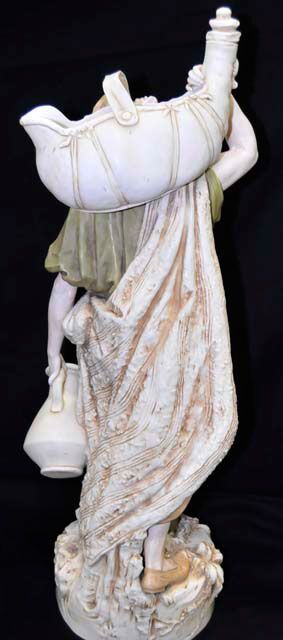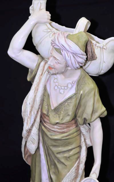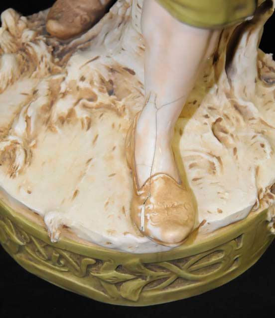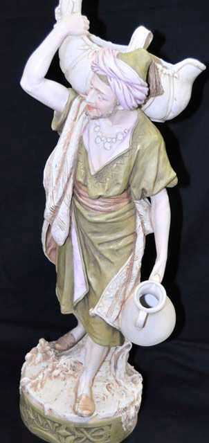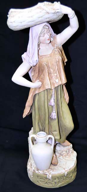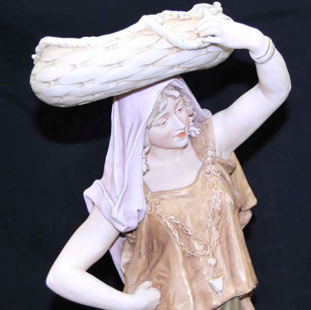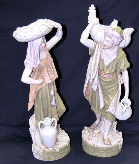 "Woman & Man Carrying Baskets". Lines on male foot & leg. Repair to man's foot. Approx. 28.5" H Please read our terms of sale.