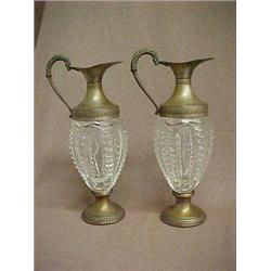 A pair of silver plated ewers, fitted round stoppers, scroll handles, Venetian glass inserts on round metal bases, stylized banding around top and base, both with partial paper label on bottom "Venetian Glass Italy", 11 1/2" h., early 20th C.