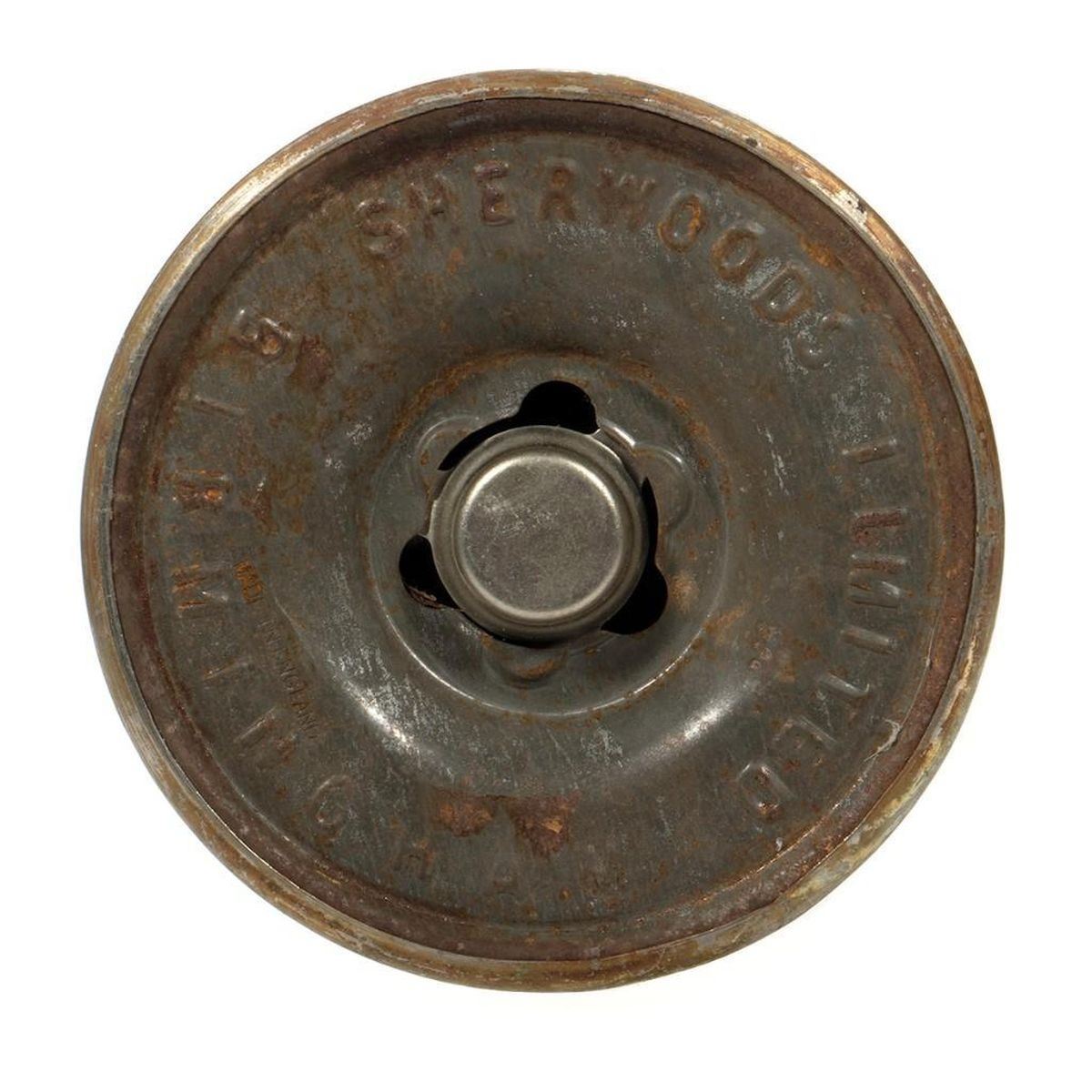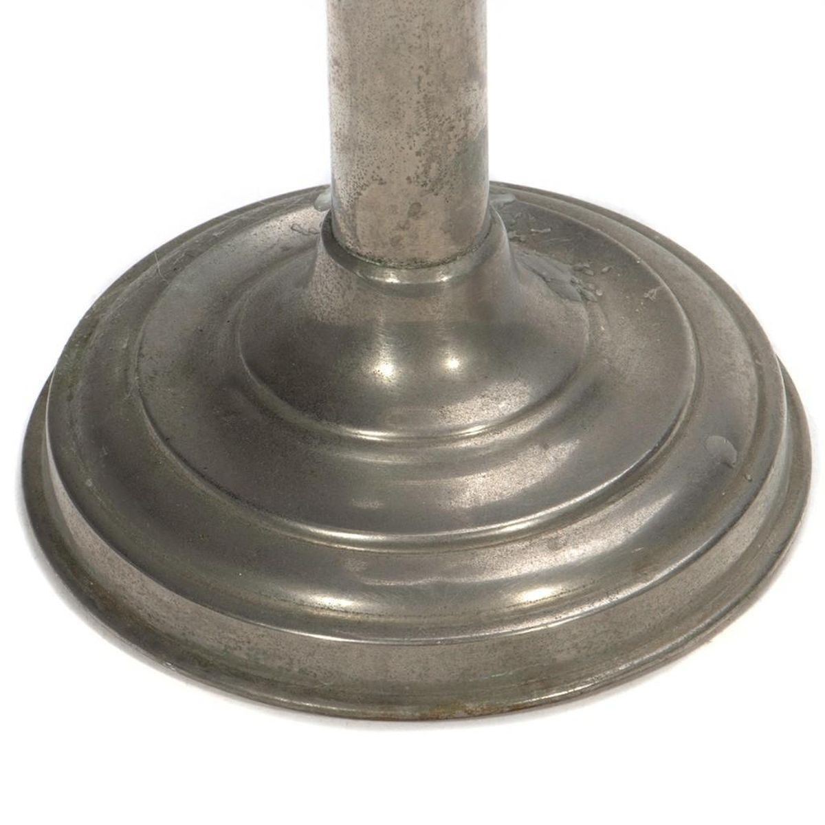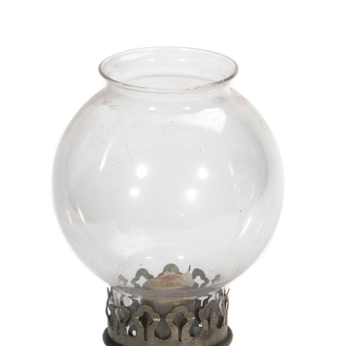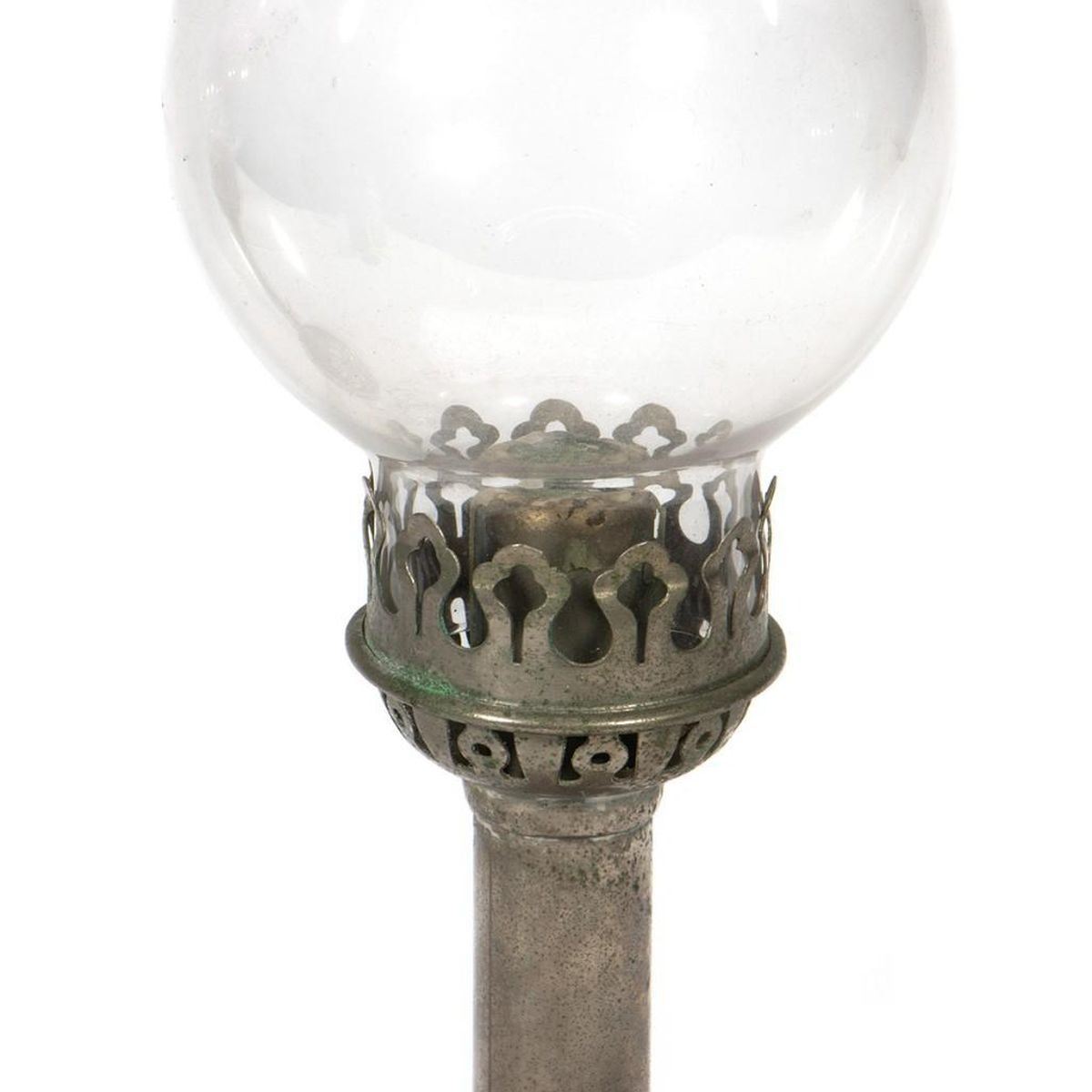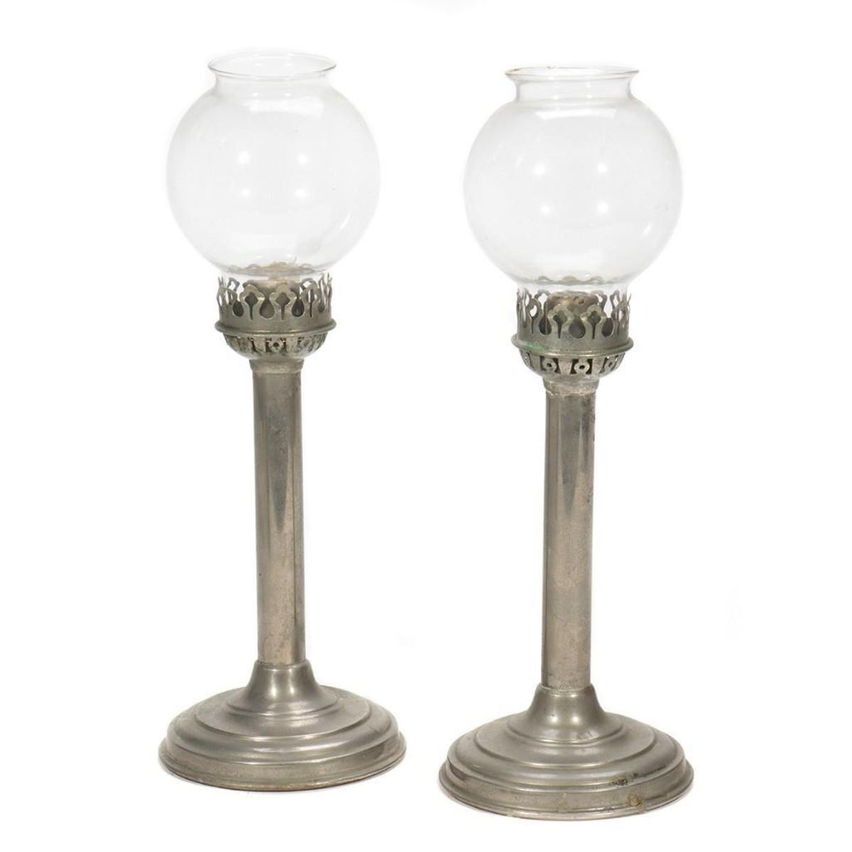 The tall sticks surmounted by globe form chimneys. Marked 'Sherwoods Birmingham' 14in. h. Condition: Some tarnish and small dings.
