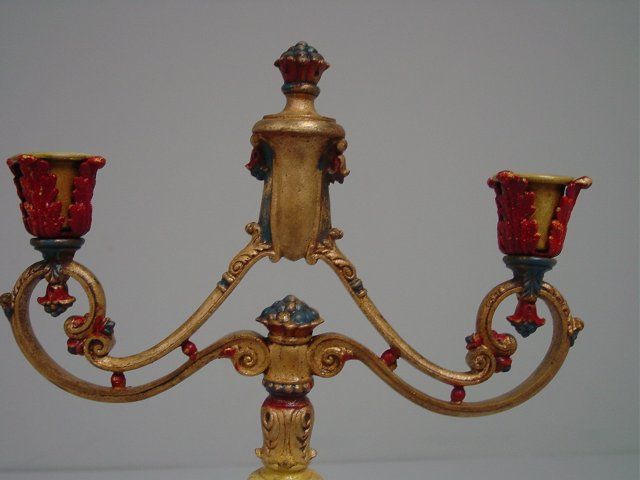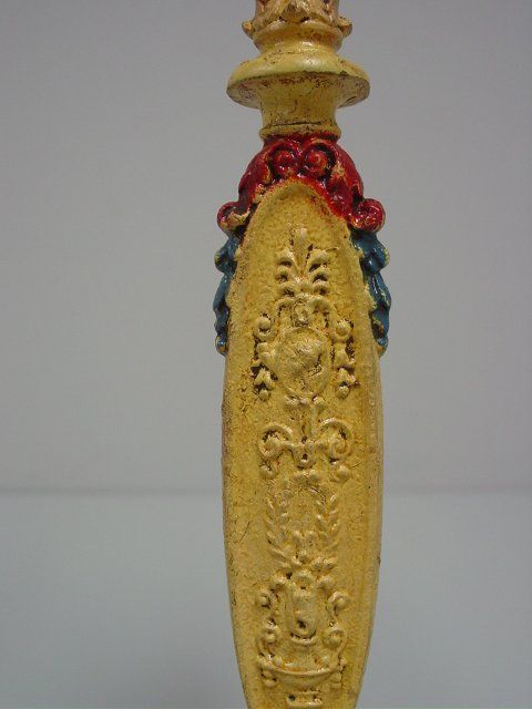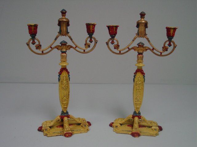 Arts & Crafts style, two arm. Red, yellow & blue. Approx. 15.5" H Please read our terms of sale.