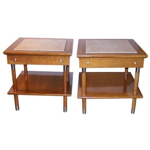 Pair of nightstands or end tables with marble insets, one drawer and one lower shelf.