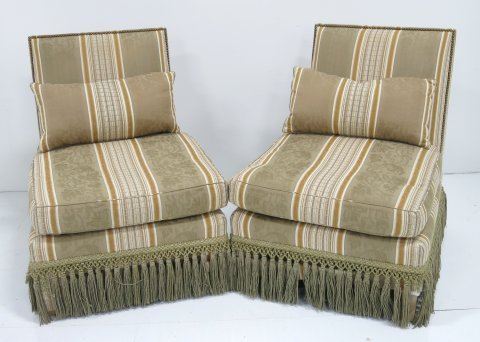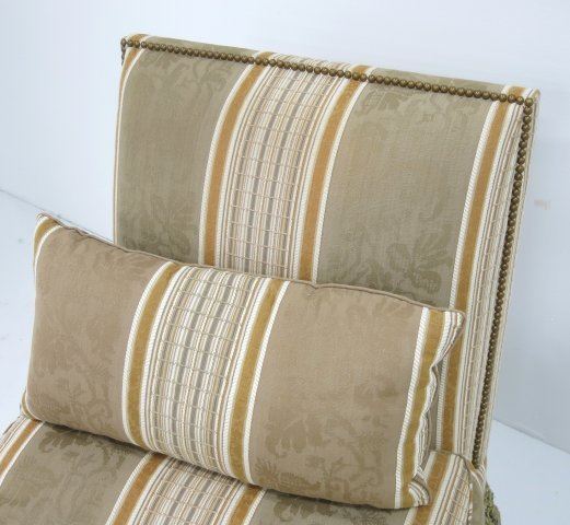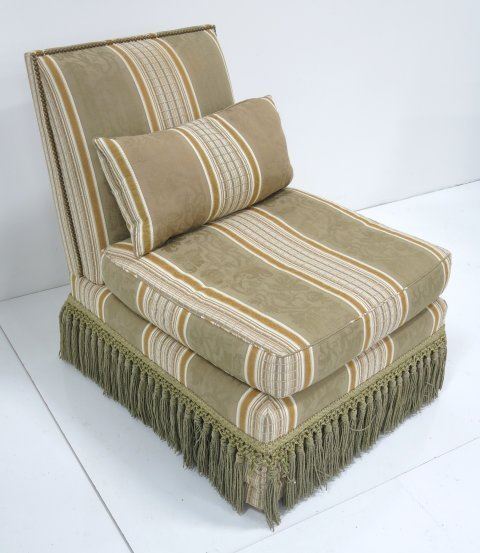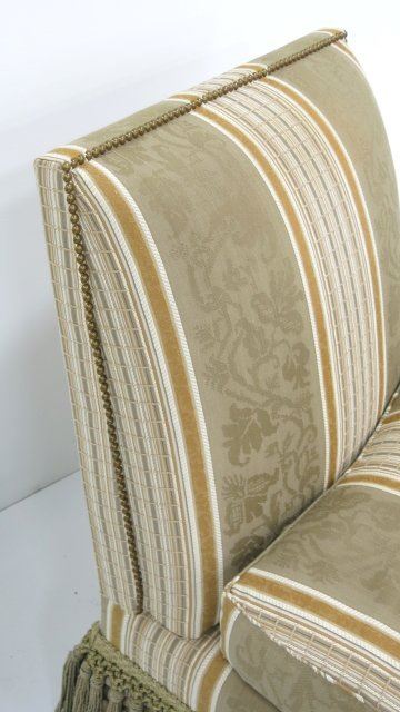Upholstered in striped olive damask with tassels, partial.