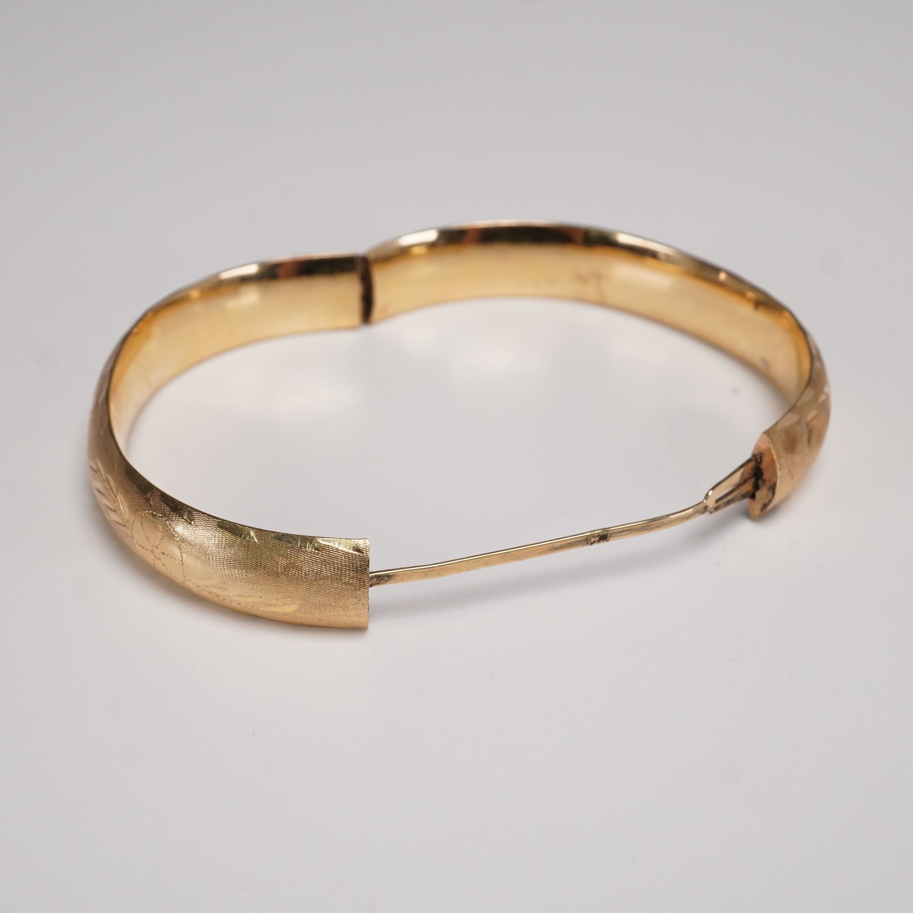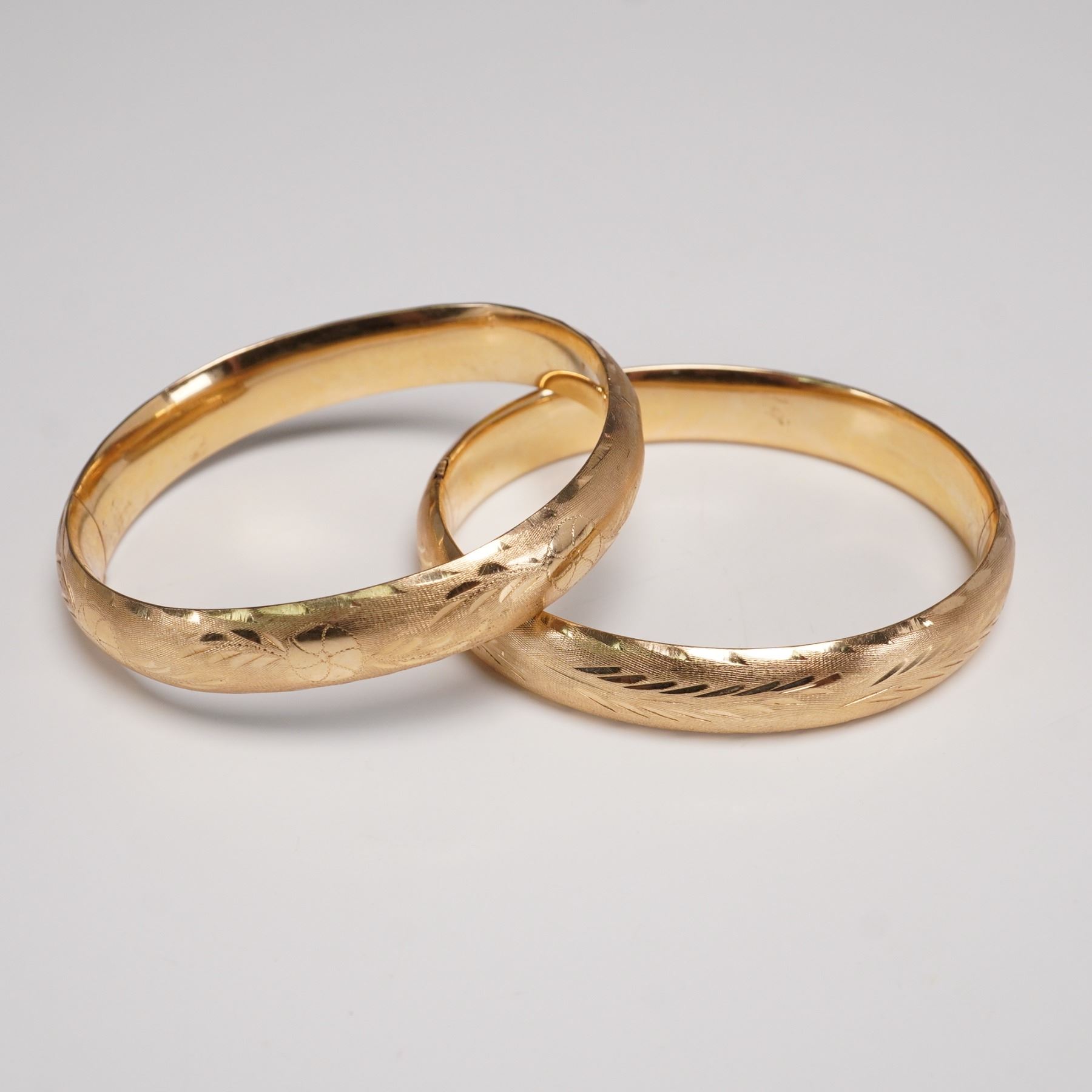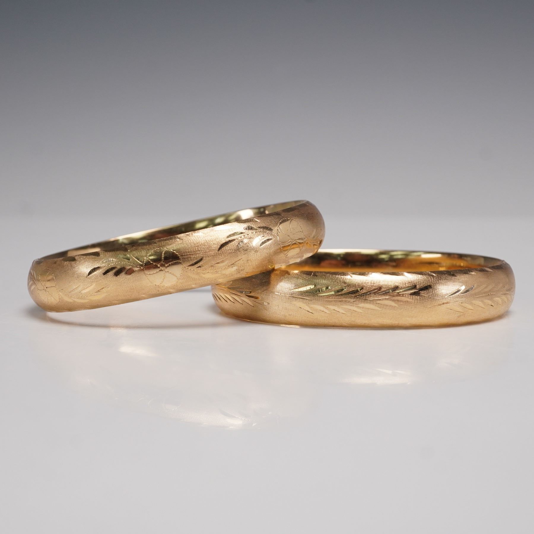 Elegant pair of matching 14K gold bangle bracelets, each designed with a softly rounded profile and detailed with engraved foliate and geometric patterns across the surface. The fine hand-engraving adds texture and shimmer, catching the light against the warm gold ground. Hinged construction allows for ease of wear, and both are marked "14K" on the interior. These bangles can be worn stacked for a dramatic effect or singly for a more understated look, making them versatile additions to any fine jewelry collection. Total weight 0.9 oz.
