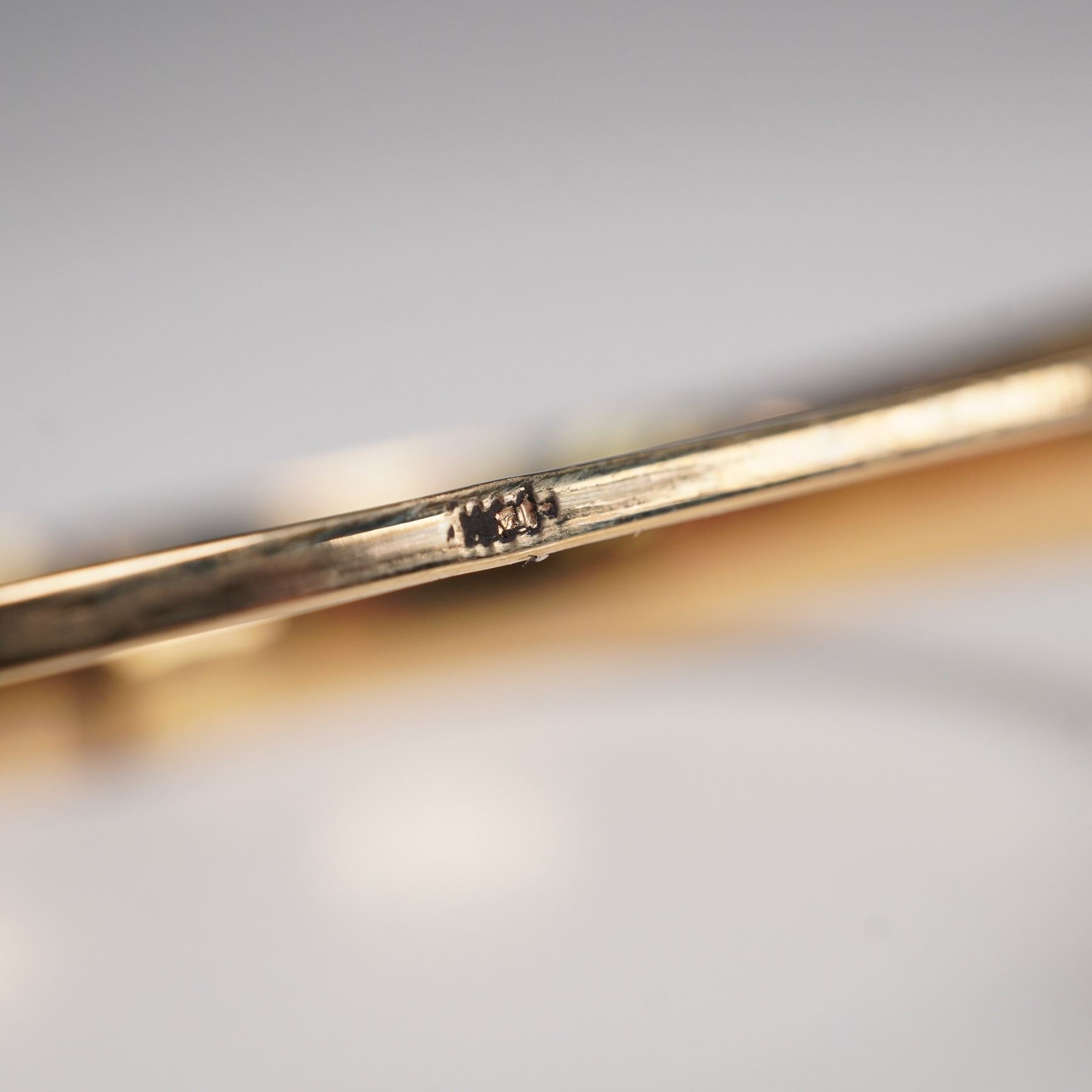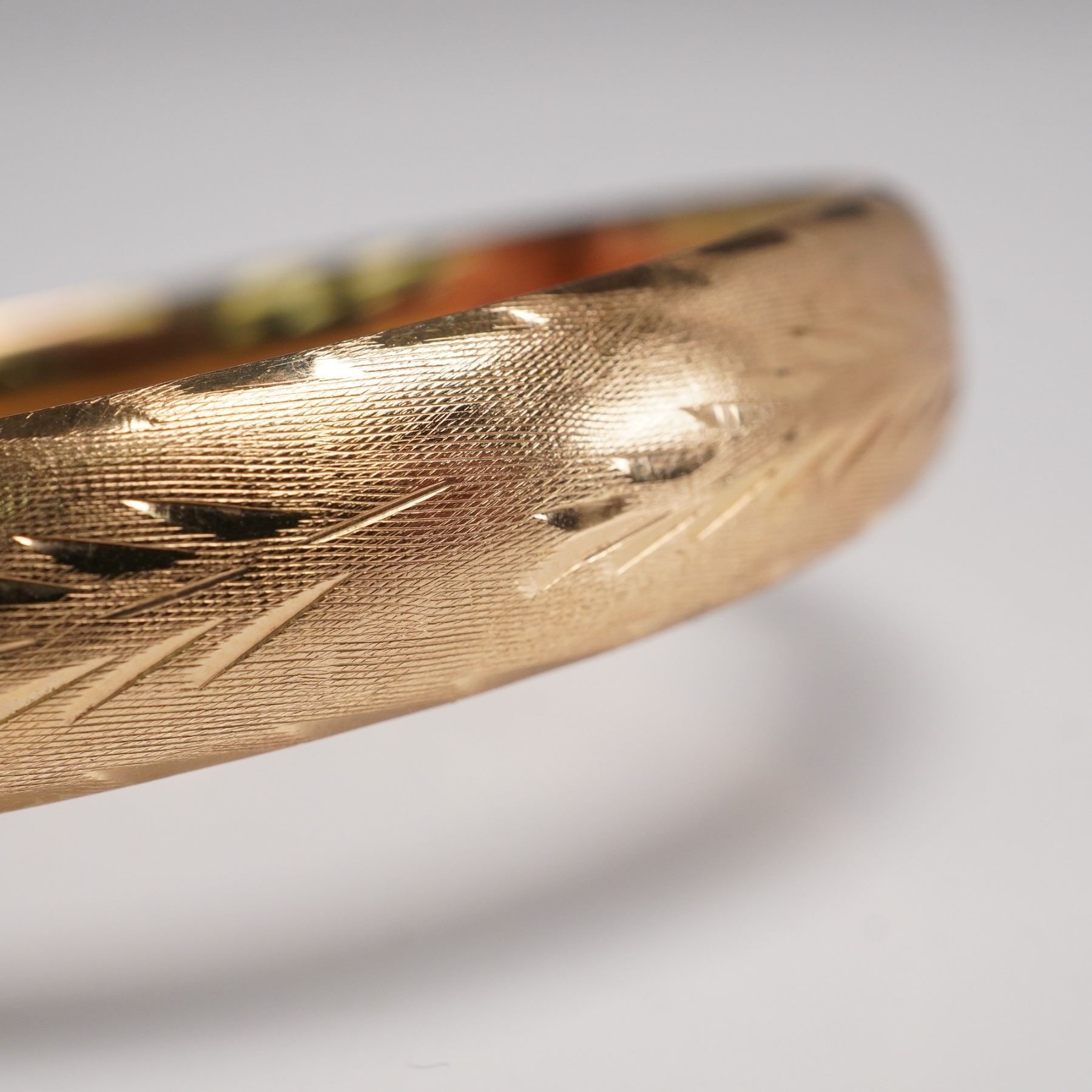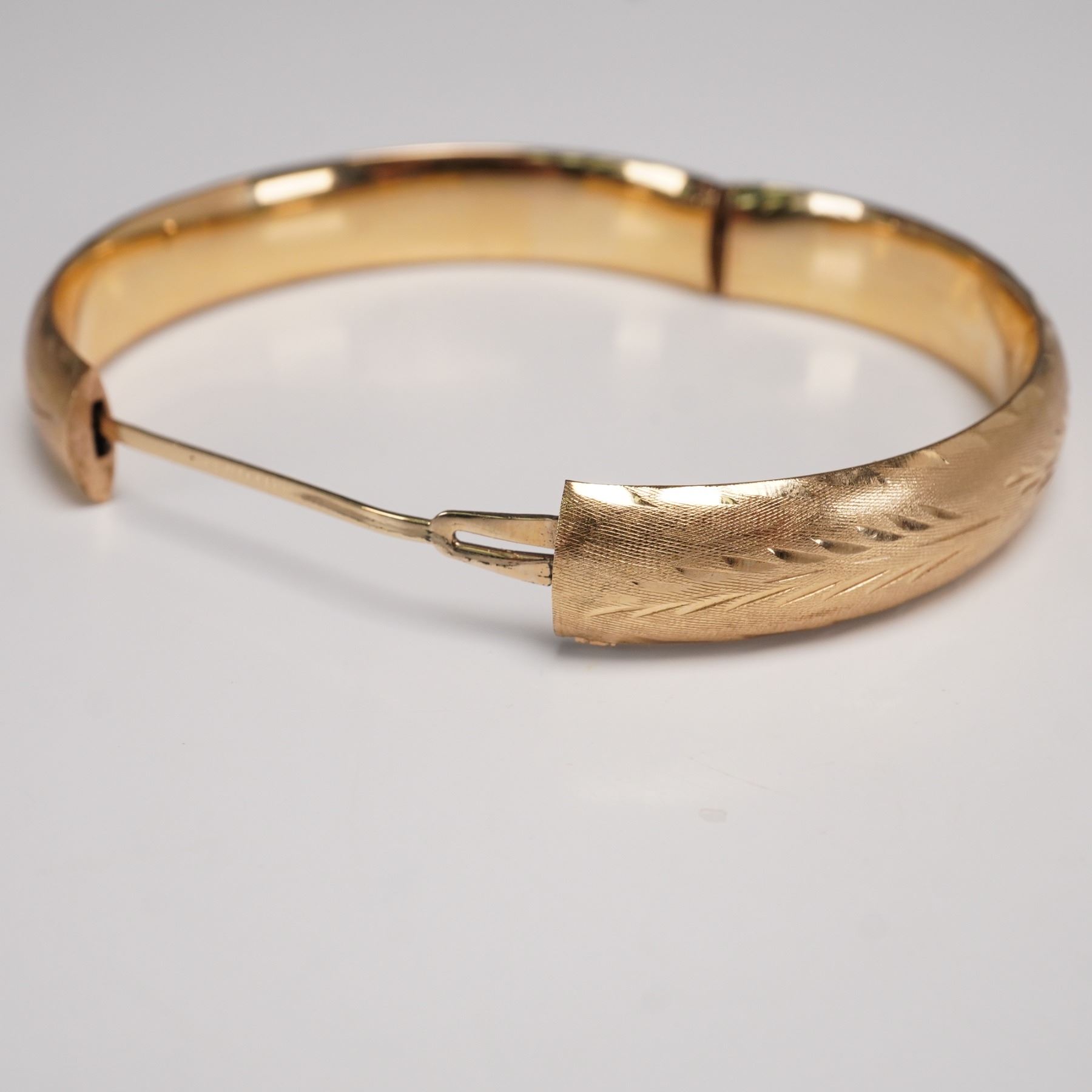 Elegant pair of matching 14K gold bangle bracelets, each designed with a softly rounded profile and detailed with engraved foliate and geometric patterns across the surface. The fine hand-engraving adds texture and shimmer, catching the light against the warm gold ground. Hinged construction allows for ease of wear, and both are marked "14K" on the interior. These bangles can be worn stacked for a dramatic effect or singly for a more understated look, making them versatile additions to any fine jewelry collection. Total weight 0.9 oz.