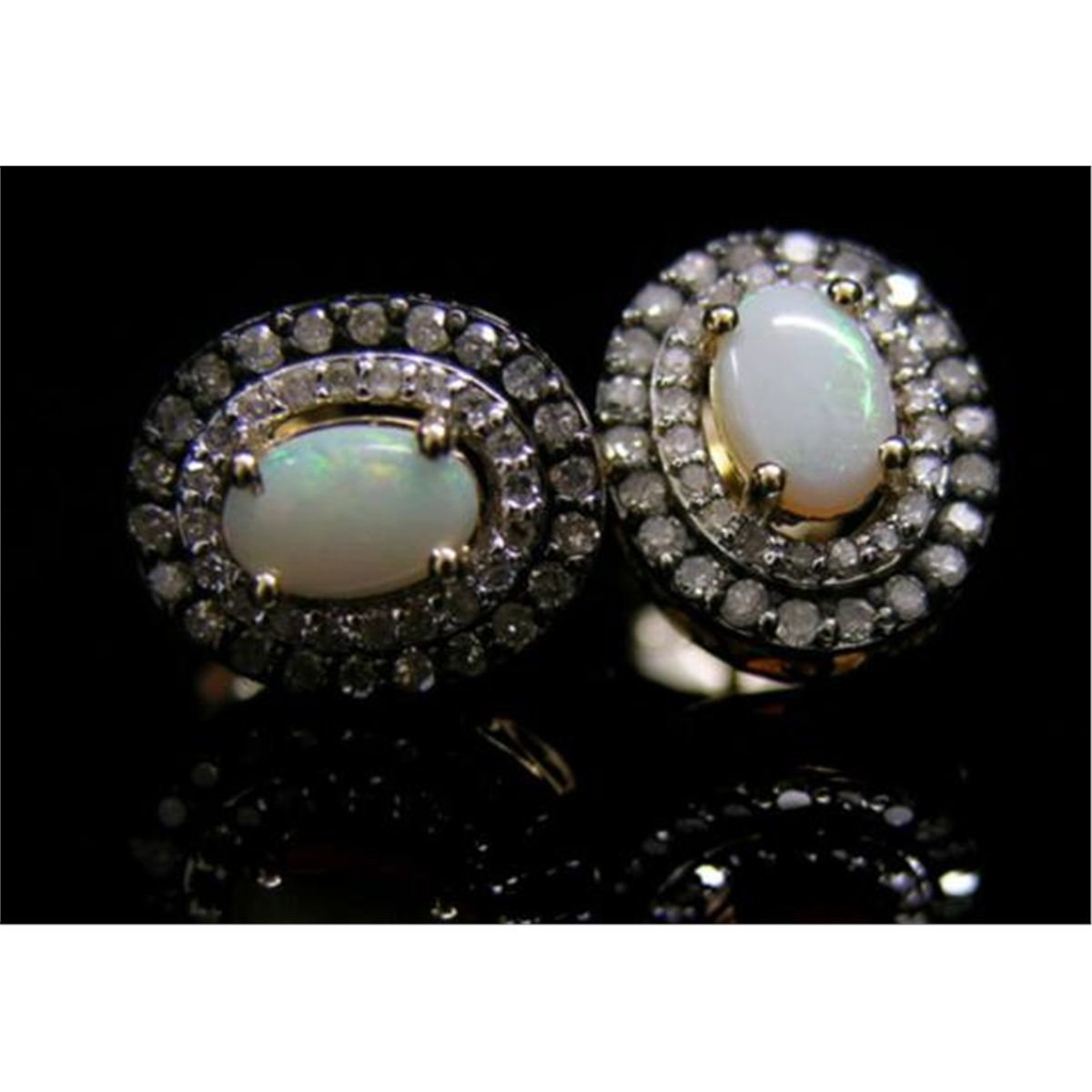 Pair of 14K Yellow Gold Pierced Earrings, each with a .45 ct. oval opal within a frame of round white diamonds atop a larger frame of round gray diamonds, total opal wt.- .9 cts., total diamond wt.- .47 cts.