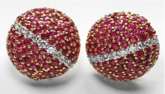 RUBY AND DIAMOND EARRINGS - A Pair of 18 Karat Yellow Gold, Ruby and Diamond Bombe Earclips, containing 22 round brilliant cut diamonds weighing approximately 1.17 carats total and 206 round brilliant cut rubies weighing approximately 10.95 carats total, earclips measure approximately 21.50 x 19.25 mm. Signed, Bianco 18K. 11.40 dwts.
