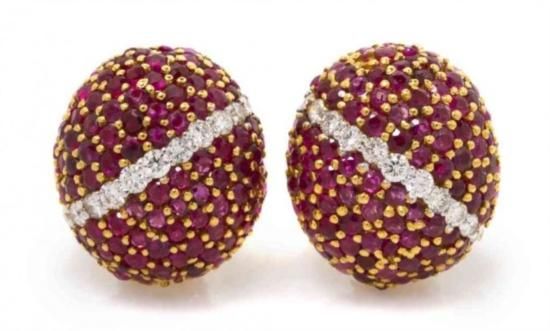 RUBY AND DIAMOND EARRINGS - A Pair of 18 Karat Yellow Gold, Ruby and Diamond Bombe Earclips, containing 22 round brilliant cut diamonds weighing approximately 1.17 carats total and 206 round brilliant cut rubies weighing approximately 10.95 carats total, earclips measure approximately 21.50 x 19.25 mm. Signed, Bianco 18K. 11.40 dwts.