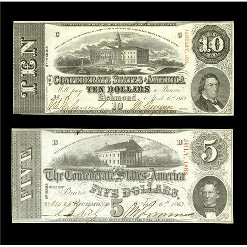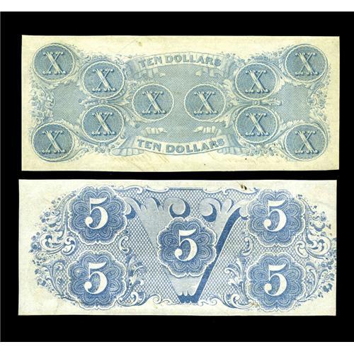 <B>Pair of 1863 Issues</B></I> T-59 $10 <B>Choice Crisp Uncirculated</B></I> and a T-60 $5 <B>Choice Crisp Uncirculated.</B></I>