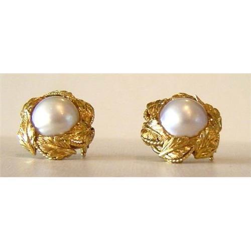 Circa. 1980. European. Each earring measures 1 inch in diameter. Gold leaves with omega clip and post back. Posts can be removed and the earrings converted to non-pierced earrings. Pearls are 10.6 mm mabe and have excellent lustre.