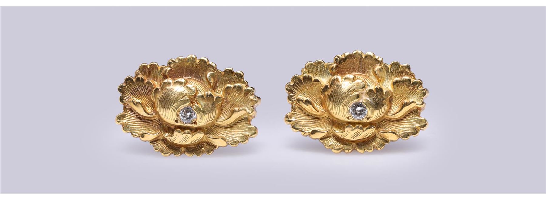 Pair of 18K Yellow Gold & Diamond Chrysanthemum Earrings by R.L. Kay containing two round cut brilliant diamonds weighing approximately 0.24 cts. Total weight is 14.8 gm. Estimated retail value $3,800.