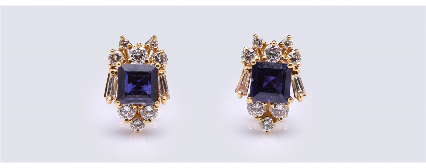 Pair of 18K Yellow Gold Iolite & Diamond Earrings containing two square cut iolite weighing approximately 0.20 cts. Twenty diamonds weighing approximately 1.50 cts. Total weight is 8.6 gm. Estimated retail value $3,900.
