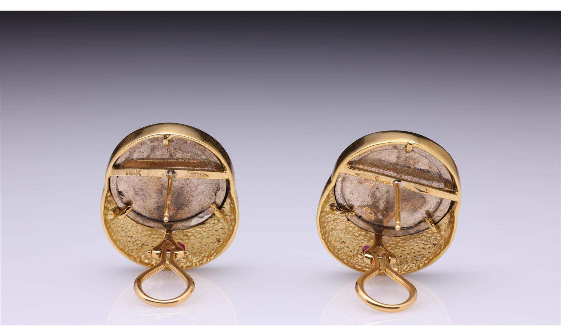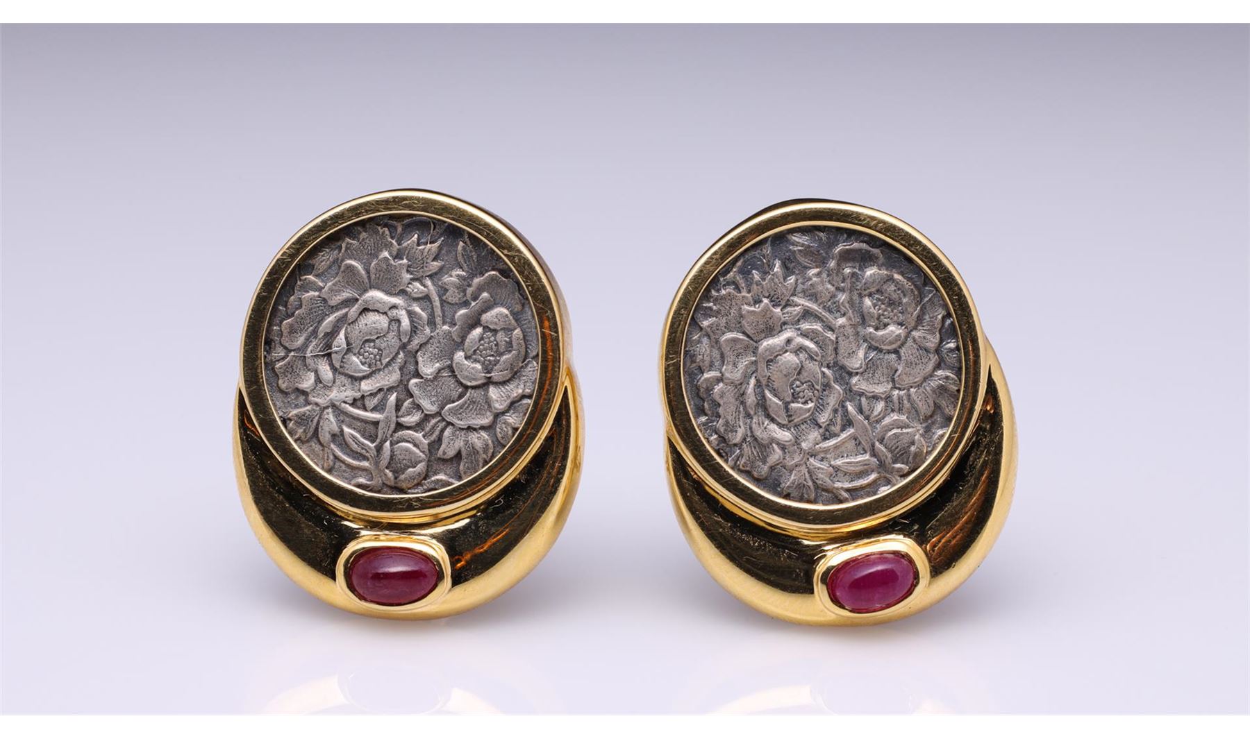Pair of 18K Yellow Gold & Ruby Earrings with Sterling Silver Floral Medallions by R.L. Kay containing two oval cabochon rubies weighing approximately 0.40 cts. Total weight is 20 gm. Estimated retail value $3,000.