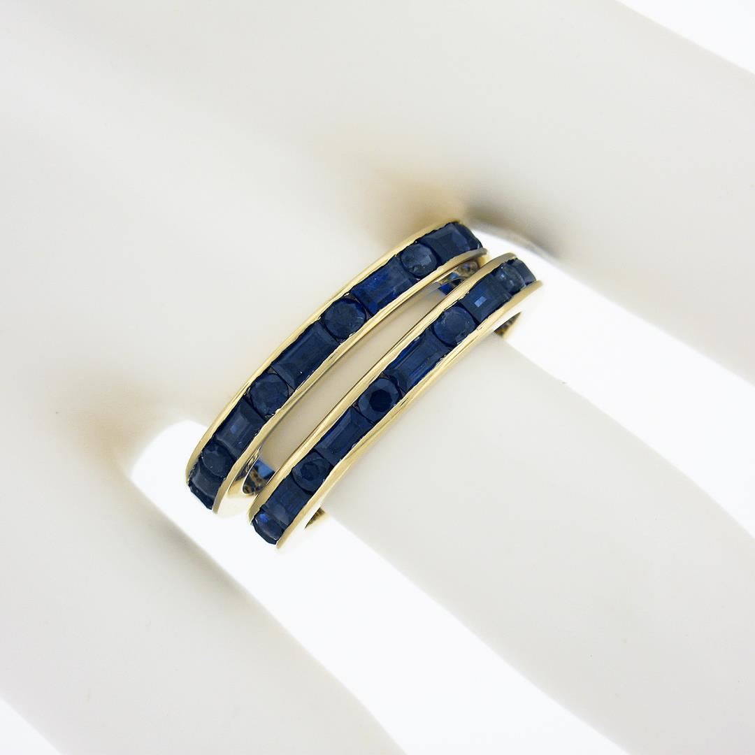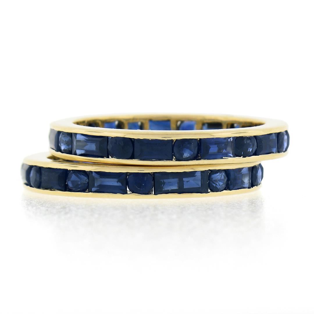 a pair of solid 18k yellow gold eternity stack bands rings, with 2 GIA graded 44 round & rectangular cut natural sapphires (4.40ctw). The rings are size 6.5, weighs a total of 5.32 grams, and measures 6mm wide both rings.Comes with all original relevant certifications.
