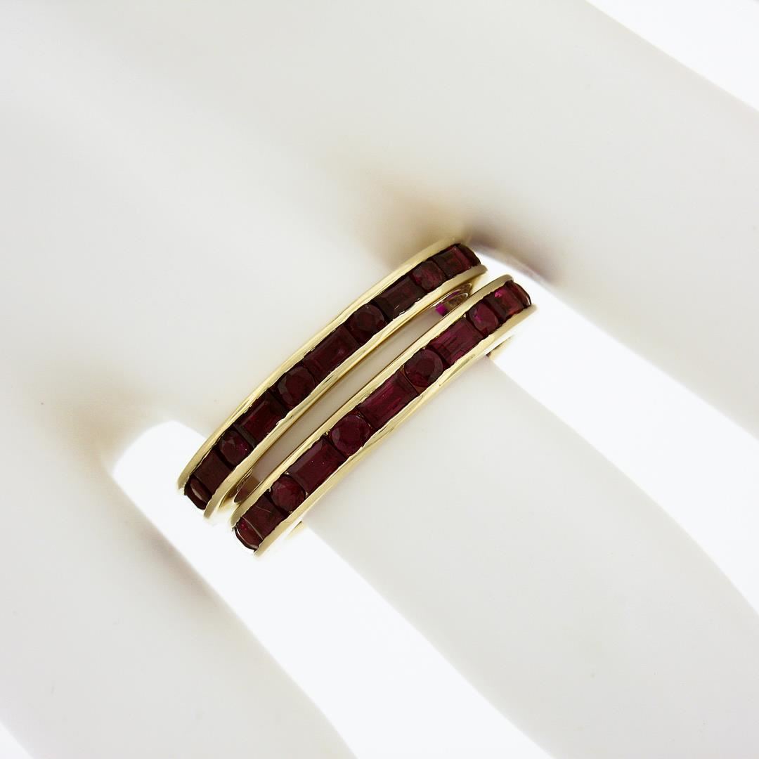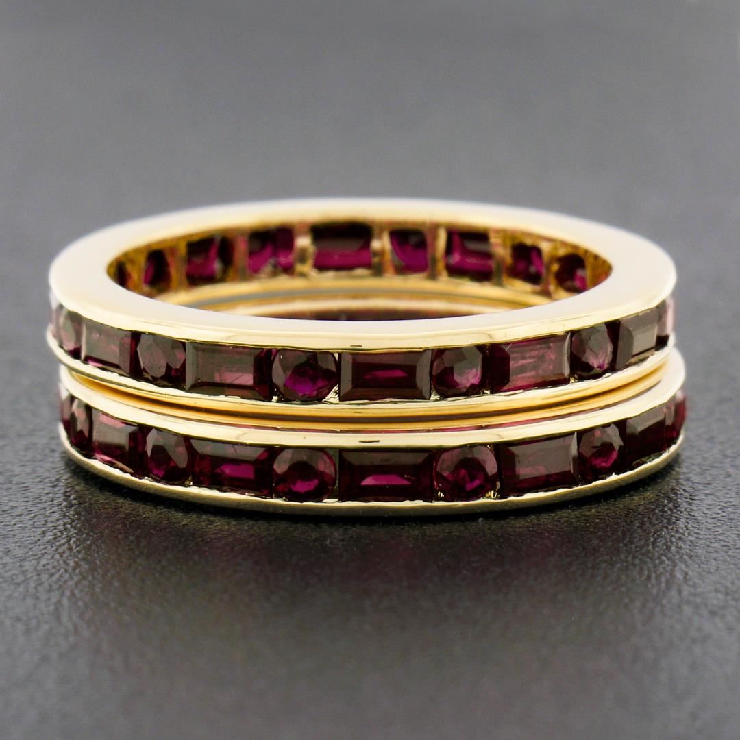 a pair of solid 18k yellow gold eternity stack bands rings, with 2 GIA graded 48 round & rectangular cut natural rubies (4.80ctw). The rings are size 6.5, weighs a total of 5.53 grams, and measures 6mm wide both rings.Comes with all original relevant certifications.