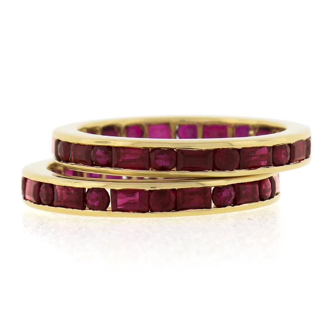 a pair of solid 18k yellow gold eternity stack bands rings, with 2 GIA graded 48 round & rectangular cut natural rubies (4.80ctw). The rings are size 6.5, weighs a total of 5.53 grams, and measures 6mm wide both rings.Comes with all original relevant certifications.