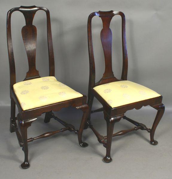 Pair of 18th Century Queen Ann mahogany chairs with upholstered slip seats, 40 3/4"h. x 21 3/4"w. x 20"d. Good condition.