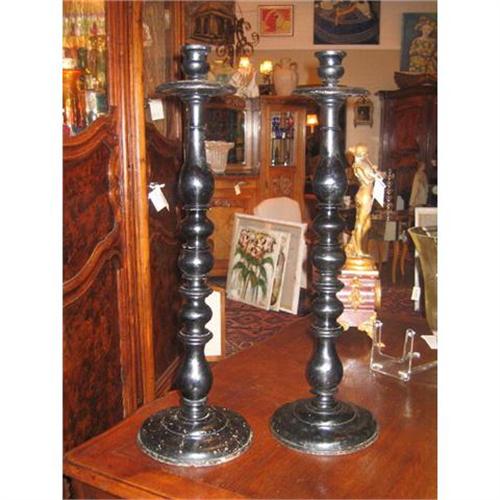 Pair of 18th-century Italian ebonized wood candlesticks. From Parma, c. 1775. Beautiful architectural accents for a table or buffet; patina and age are wonderful.