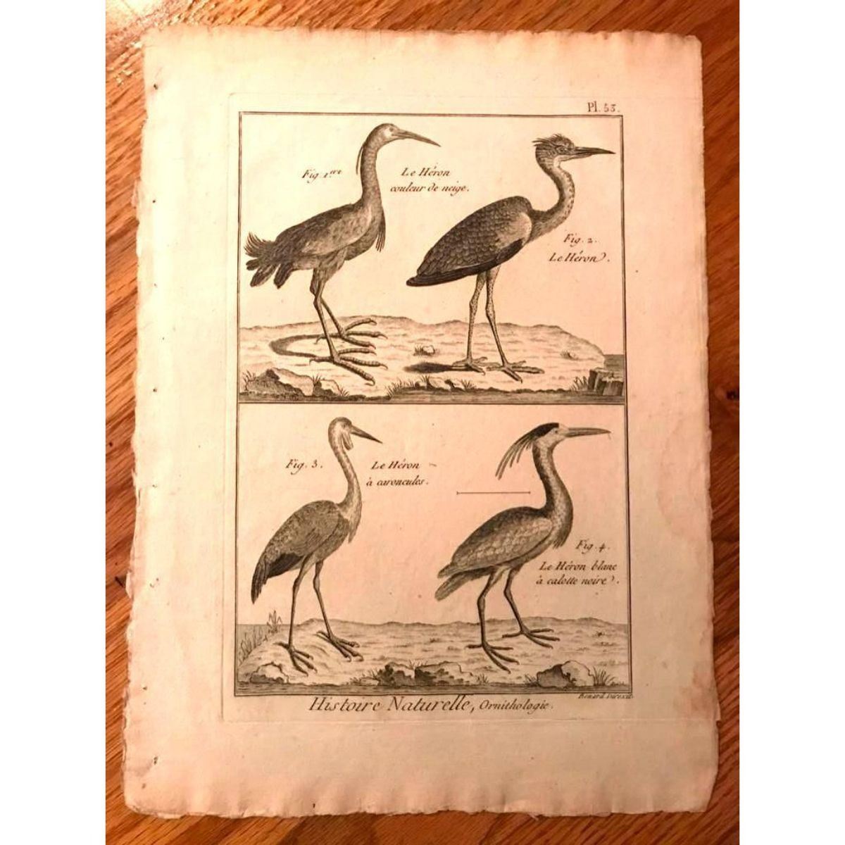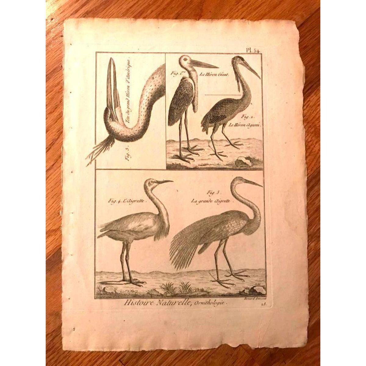 Pair of 18th Century French copperplate engravings, plates, Histoire Naturelle, Ornithologie, herons, cranes. Plate 53 & 54. Approx 9 1/2" X 12 1/2". These antique engravings originate from 'The Encyclopeie ou Dictionnaire raisonne des sciences, des arts et des metiers, par une Societe de Gens de lettres'  published under the direction of Diderot & d'Alembert, with 17 volumes of text and 11 volumes of plates between 1751 & 1772. It contained 72,000 articles written by more than 140 contributors. This encyclopedia was a massive reference work for the arts and sciences, as well as a means to propagate the ideas of the French Enlightenment. The impact of this encyclopedia was enormous. Artists & Engravers: Denis Diderot (1713-1784) was a French philosopher, art critic & writer. Jean le Rond d'Alembert (1717-1783) was a French mathematician, physicist & philosopher. These plates are engraved by J.A.Defehrt & Bonaventure/Benoit-Louis Prevost after J.R Lucotte or Goussier.
