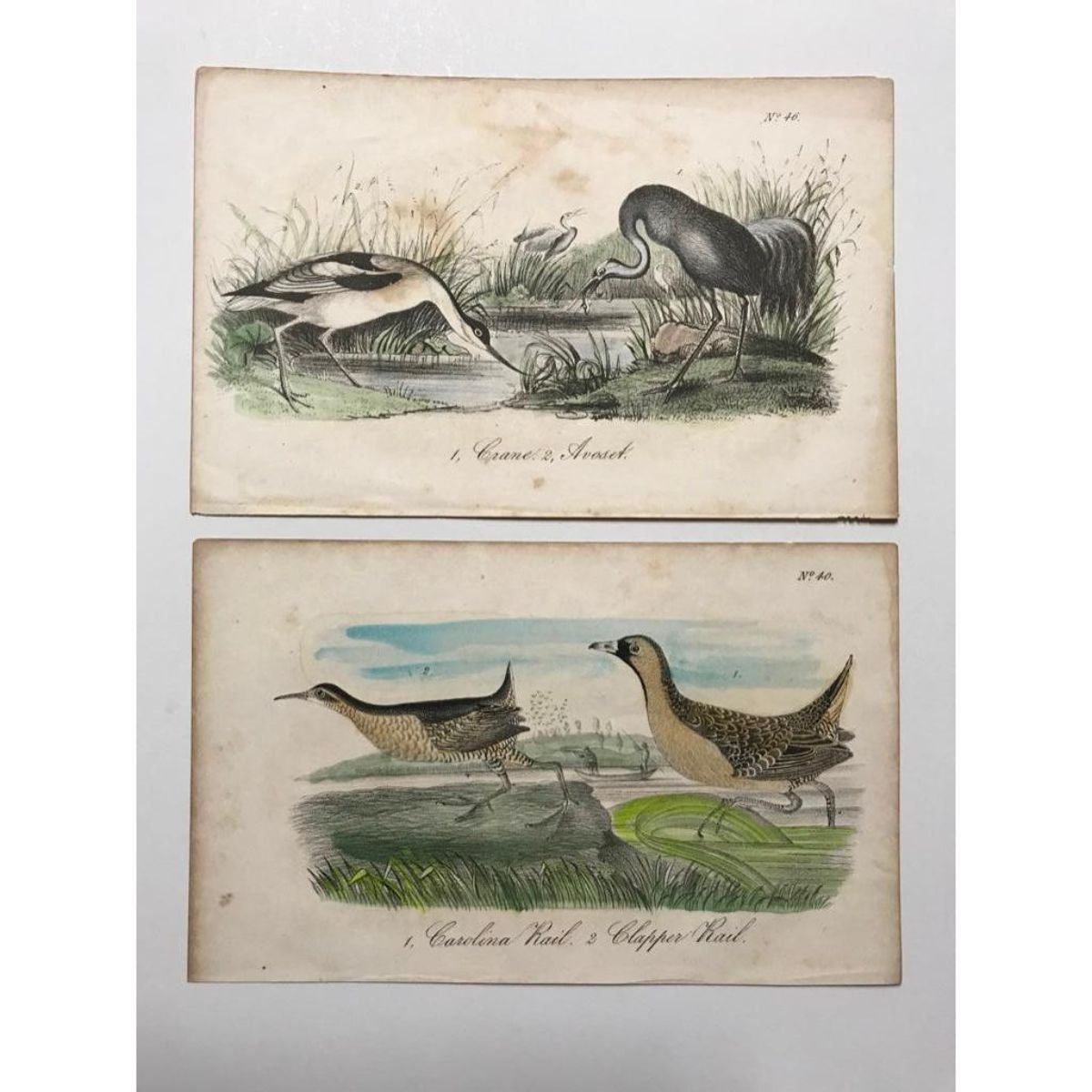 18thc hand-colored book plate engravings - No. 40, 1. Carolina Rail. 2 Clapper Rail. - No 46, 1. Crane. 2. Avoset. Approx 5 1/2" X 8 1/2" each. * some foxing commensurate with age.